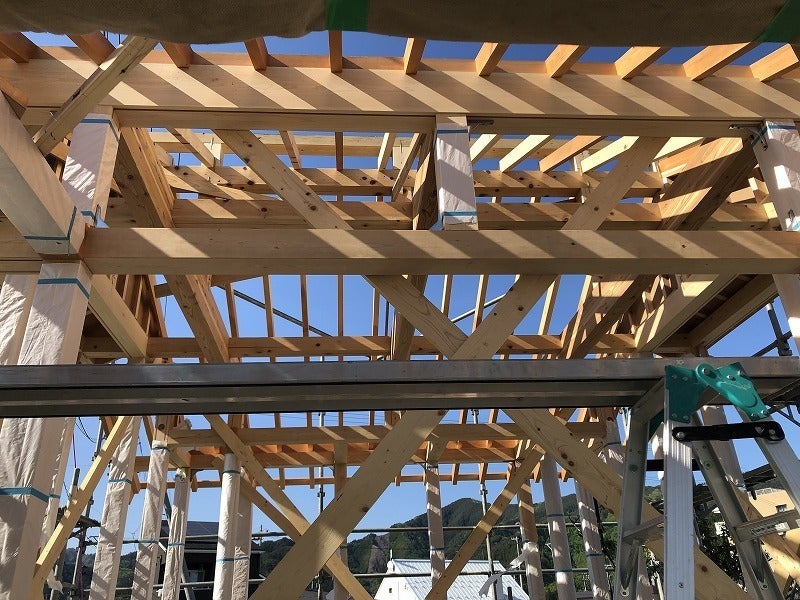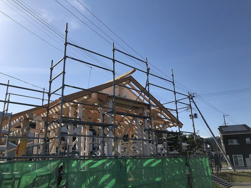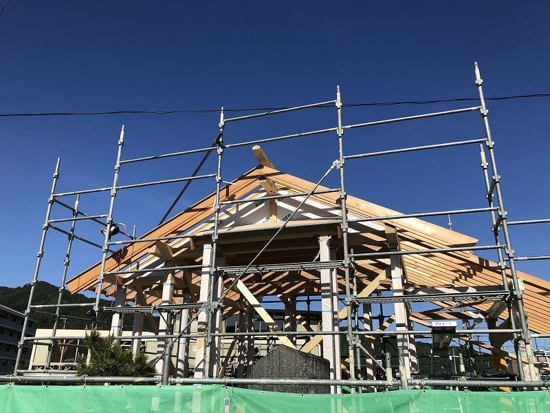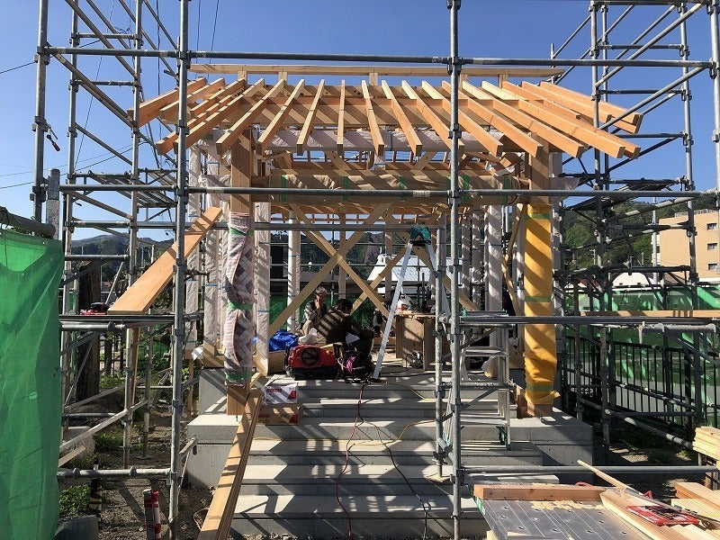 前回は基礎のコンクリートのみの状況でしたが、現在は柱や梁もできてきており、だいぶ社らしくなってきました。