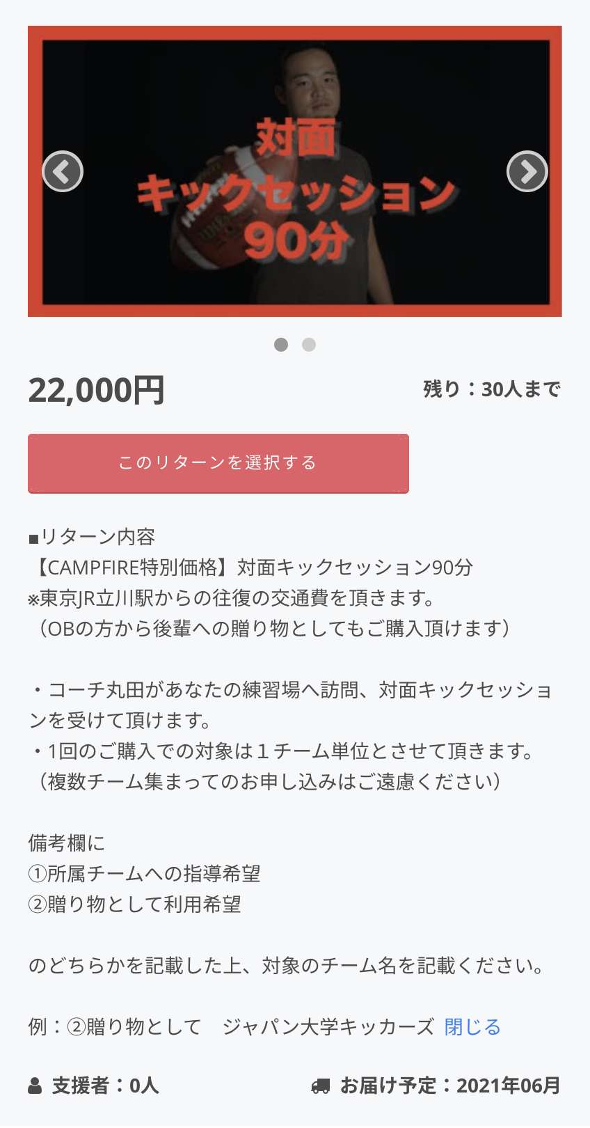 こんにちは!JKA丸田です。いつも応援して頂きありがとうございます!このクラウドファンドも、支援募集終了まであと5日となりました!!CFLドラフトを機に、既に支援頂いた方から追加の支援を頂きました!本当にありがとうございます!残り5日、ラストスパートをかける為に私が持っている1番大事なものをリターンに追加しました。私が訪問してキックの指導をさせて頂く、「対面キックセッション」です。つまり、私が人生をかけて培った「キックの指導の技術」と「私の生命時間」です。※交通費を別途頂きます。予めご了承ください※限定30人とさせて頂きます。もちろん、所属するチームや自分の為にご購入頂けます。「OBの方が購入頂いて、母校の後輩へ贈る」といったお洒落な活用のされ方もオススメです。是非、リターンの欄をチェックしてみてください!!それではまた!!丸田