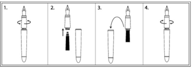 最初の作業は「インクカートリッジの入れ方」、まず万年筆の軸を外して、インクカートリッジをペン先に奥まで真っすぐに差し込んでセットします。カートリッジを装着後、しばらく置いてインクがペン先まで出るまで待ちます。