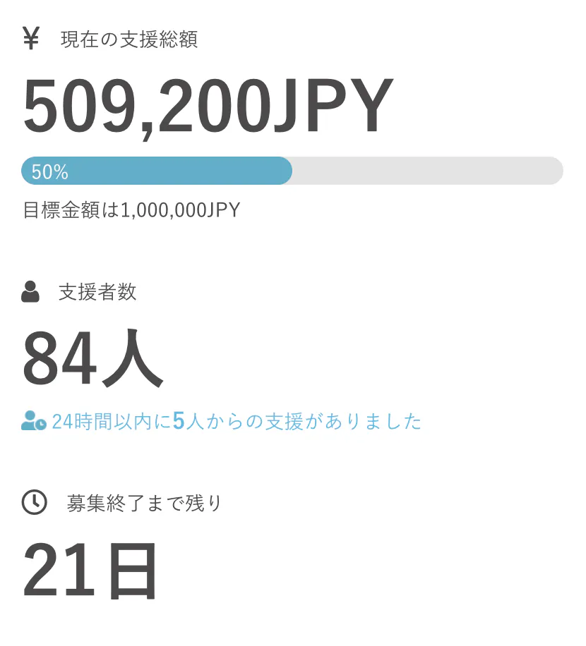 ついに支援総額が50万円を超え、達成率50%を達成しました!!!