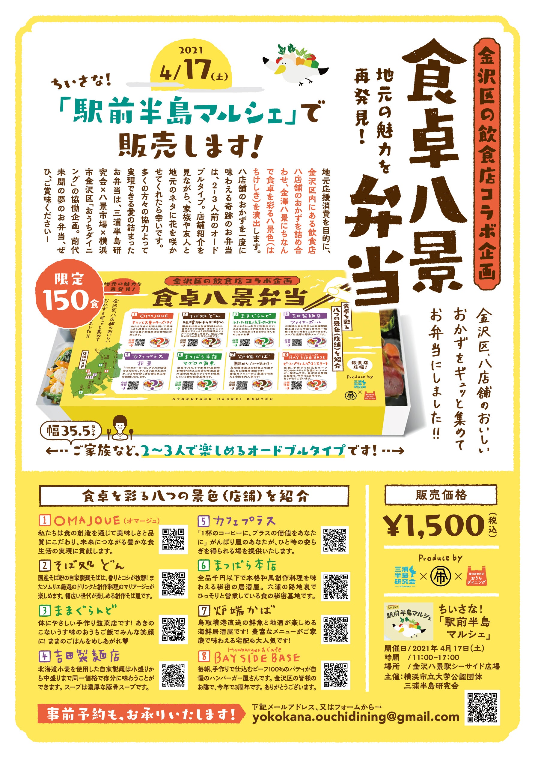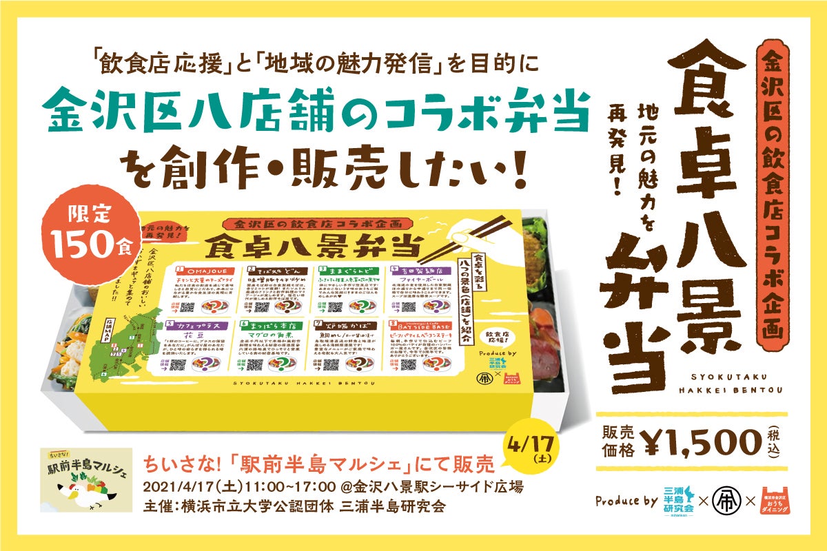 はじめまして。金沢区の飲食店コラボ企画「食卓八景弁当」企画チームです。コロナ禍で苦戦する横浜市金沢区の飲食店と三浦半島農家の応援目的で開催される「ちいさな駅前半島マルシェ(2021年4月17日 土)」内で、金沢区の飲食店8店舗のおかずを詰め合わせたコラボレーション企画「食卓八景弁当」を創作・販売するため、三浦半島研究会×八景市場×横浜市金沢区「おうちダイニング」の有志3チームが企画の実現に向けて鋭意準備中です。この「食卓八景弁当」を通して飲食店を紹介し、地元の味を多くの方に届け飲食店応援に繋がればと思っております。この企画をたくさんの方に知ってもらうためにお力添えをいただきたくクラウドファンディングのプロジェクトを立ち上げました。