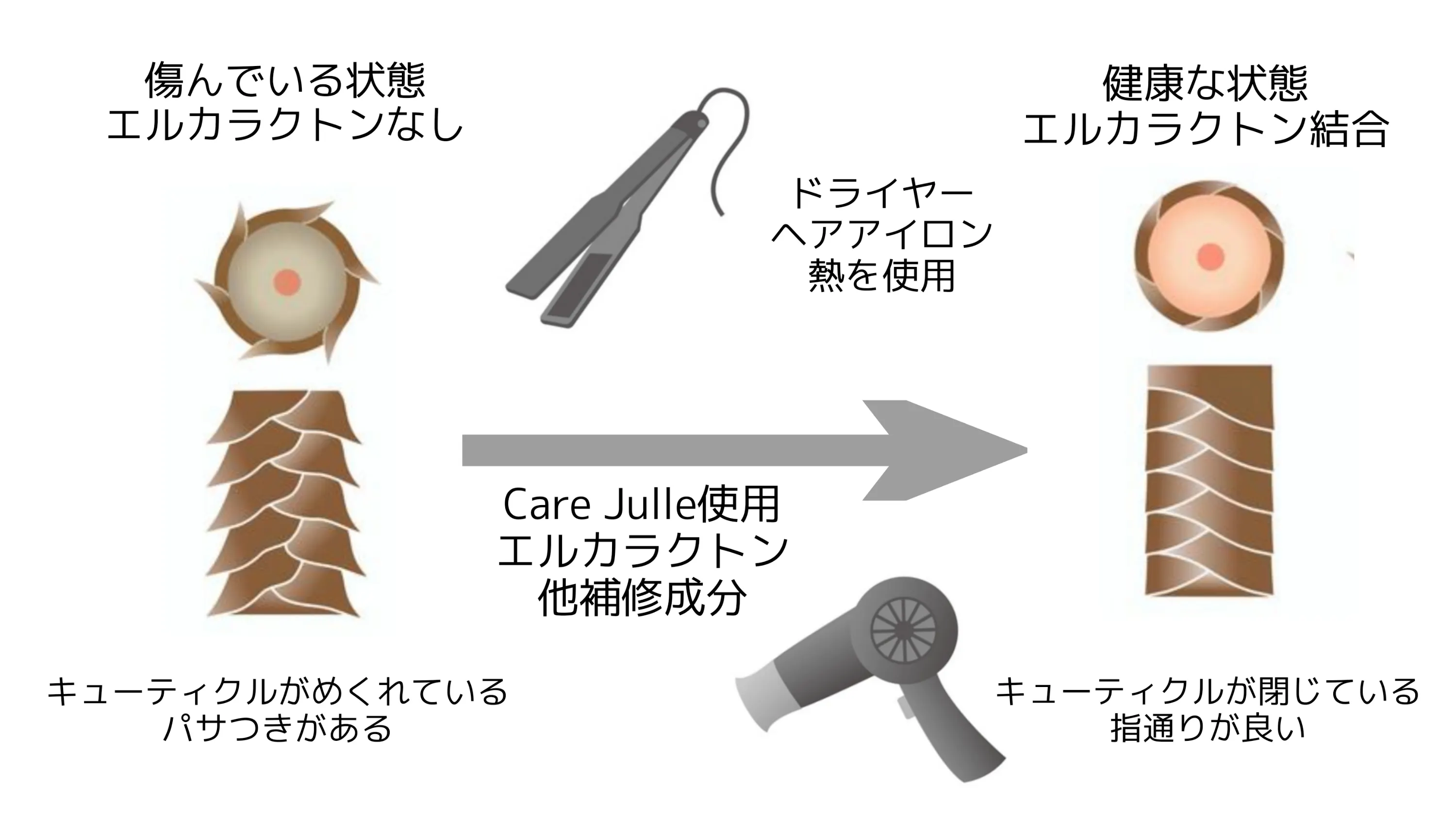 成分には拘りが沢山詰まっていますが中でも[エルカラクトン(γ-ドコサラクトン)]という成分がドライヤーやヘアアイロンの熱で反応し結合、補修してくれます