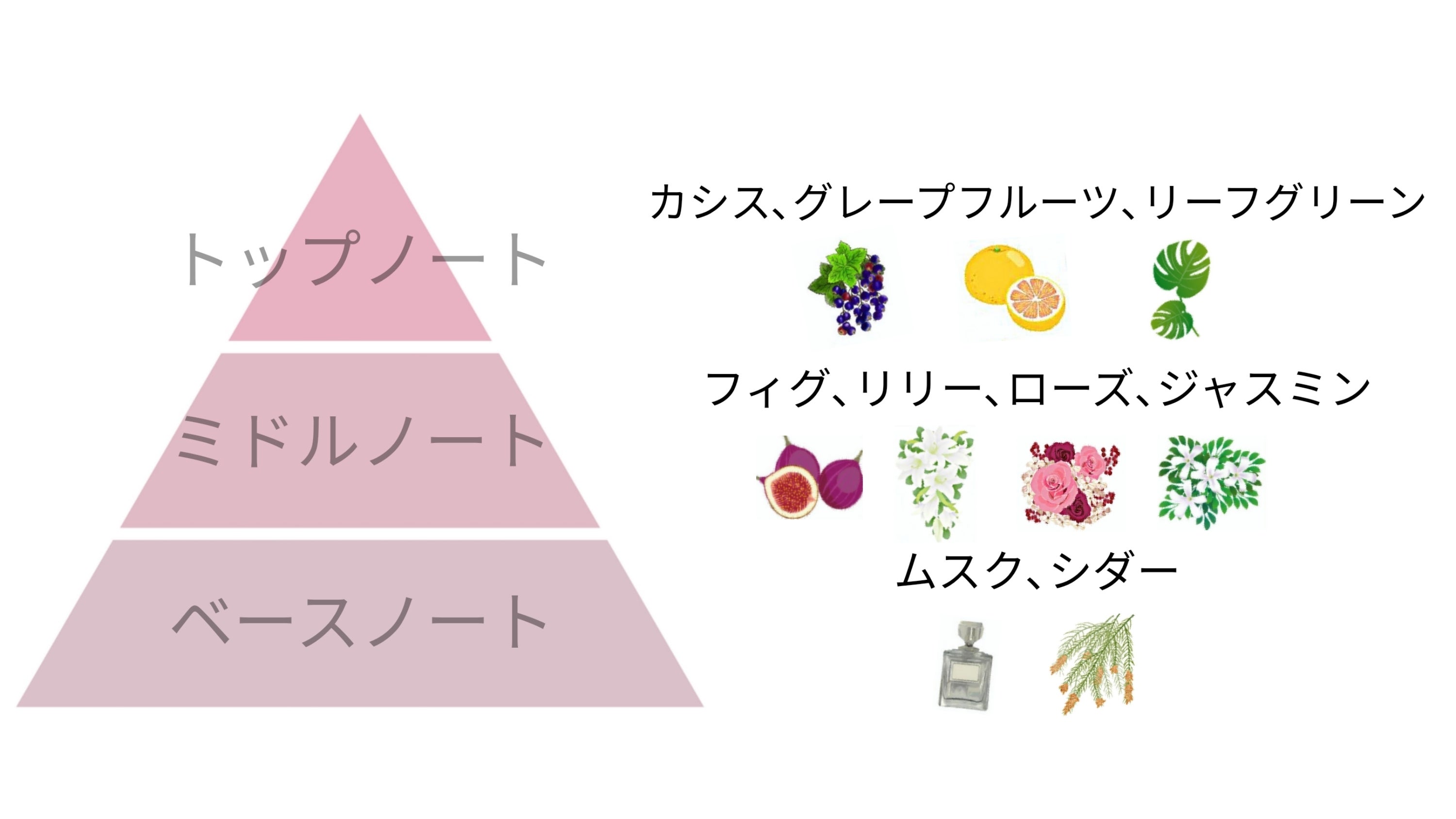 香りはオリジナルでフレッシュなフィグを中心にカシス、グレープフルーツ等のジューシーなトップノートをプラスし、リリー、ローズ、ジャスミン等のライトなフローラルブーケのミドルノートを加え、ムスク、シダー等のベースノートで上品にまとめた軽やかな甘さが香る、ホワイトフィグ調の香りとなっています
