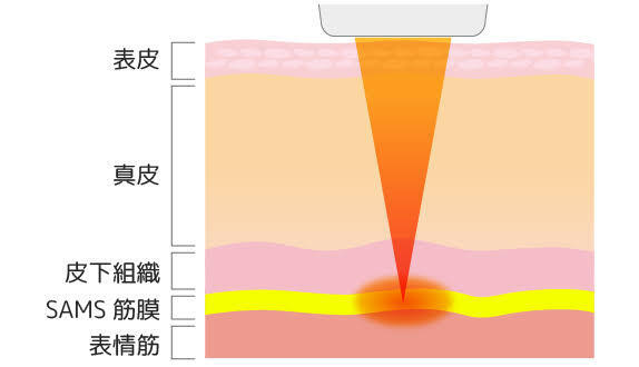 表皮、真皮、脂肪層、SMAS筋膜に対して高密度焦点式超音波(HIFU:High Intensity Focused Ultrasound)により熱を与えることができる技術です