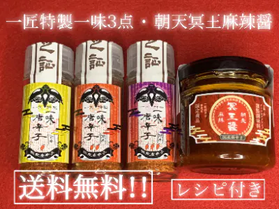 【リターン5】【旨辛・激辛・獄辛一味3点セット】+【朝天麻辣冥王醤】+簡単レシピ