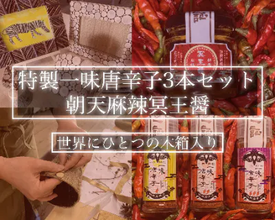 【リターン8】【木工職人の木箱入り】一匠特製一味3本+朝天麻辣冥王醤1本セット