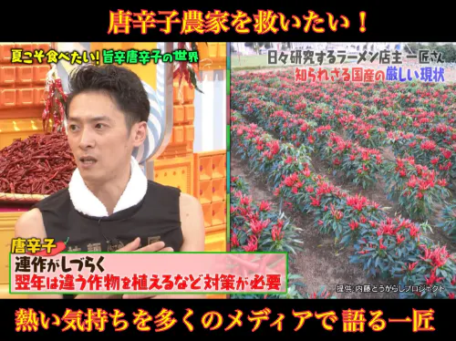 お陰様で多くのメディア取材や出演、日本最大級の唐辛子イベントの公式一味監修や国産唐辛子を使用したハーブティーや冷凍食品等の販売なども行えるようになりました。