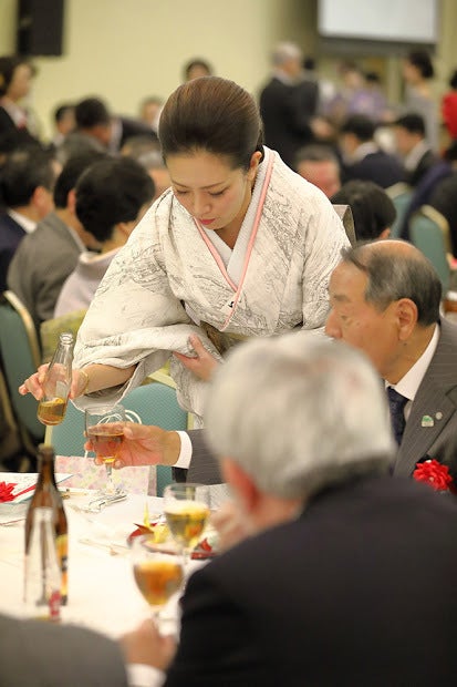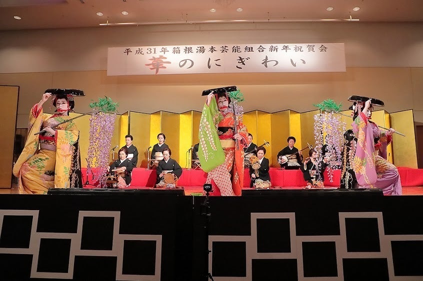 毎年1月の始めに湯本富士屋ホテルさんにて新年会を開催しております。大勢のお客様と100名の芸者衆と共に新年を祝うパーティーです。フルコースのお食事 、各テーブルでは芸者衆がおもてなしをします。舞台では華やかな踊りや芸者バンド、豪華景品の当たるくじ引き、ラストでは芸者衆がお客様を交えて会場内を練り歩きます。