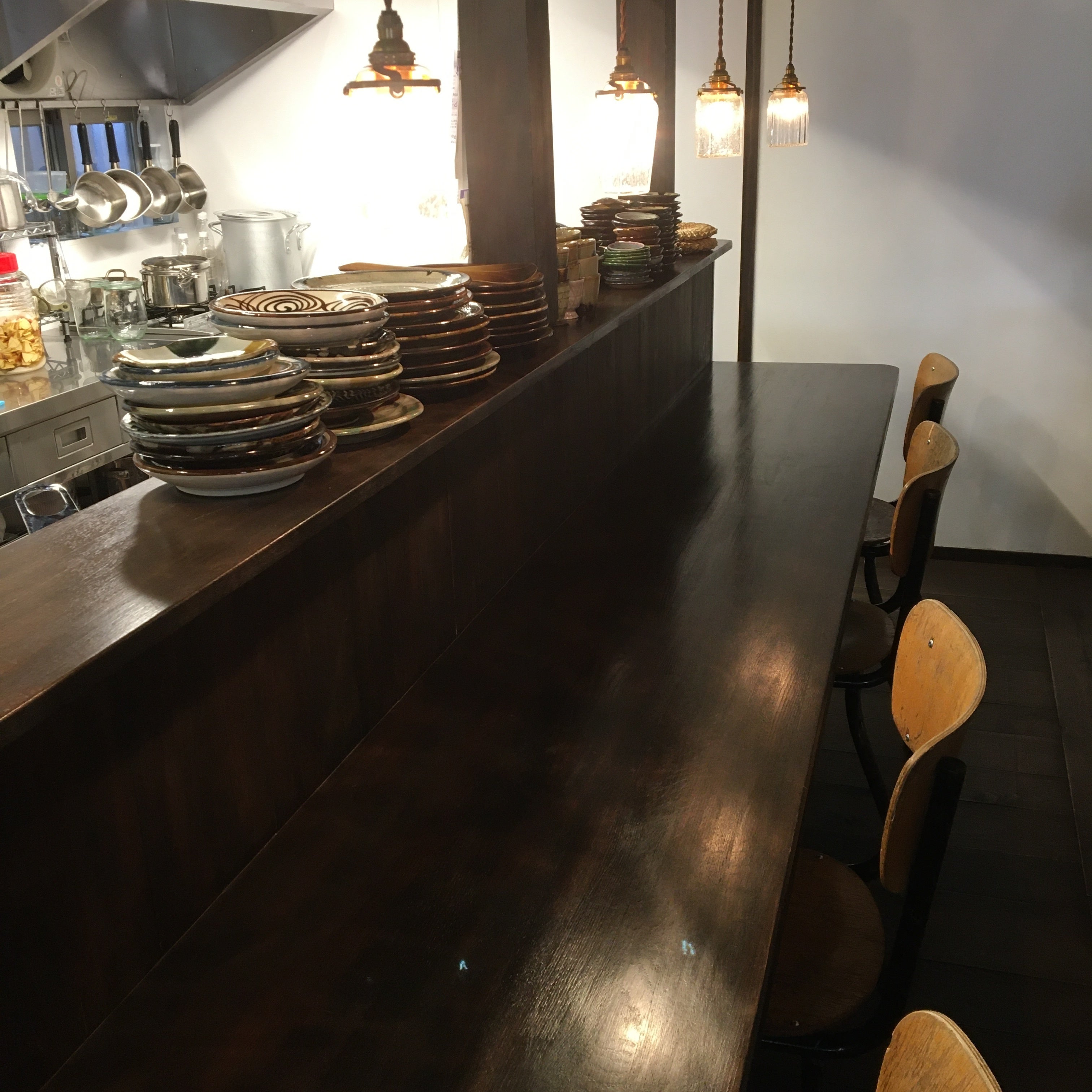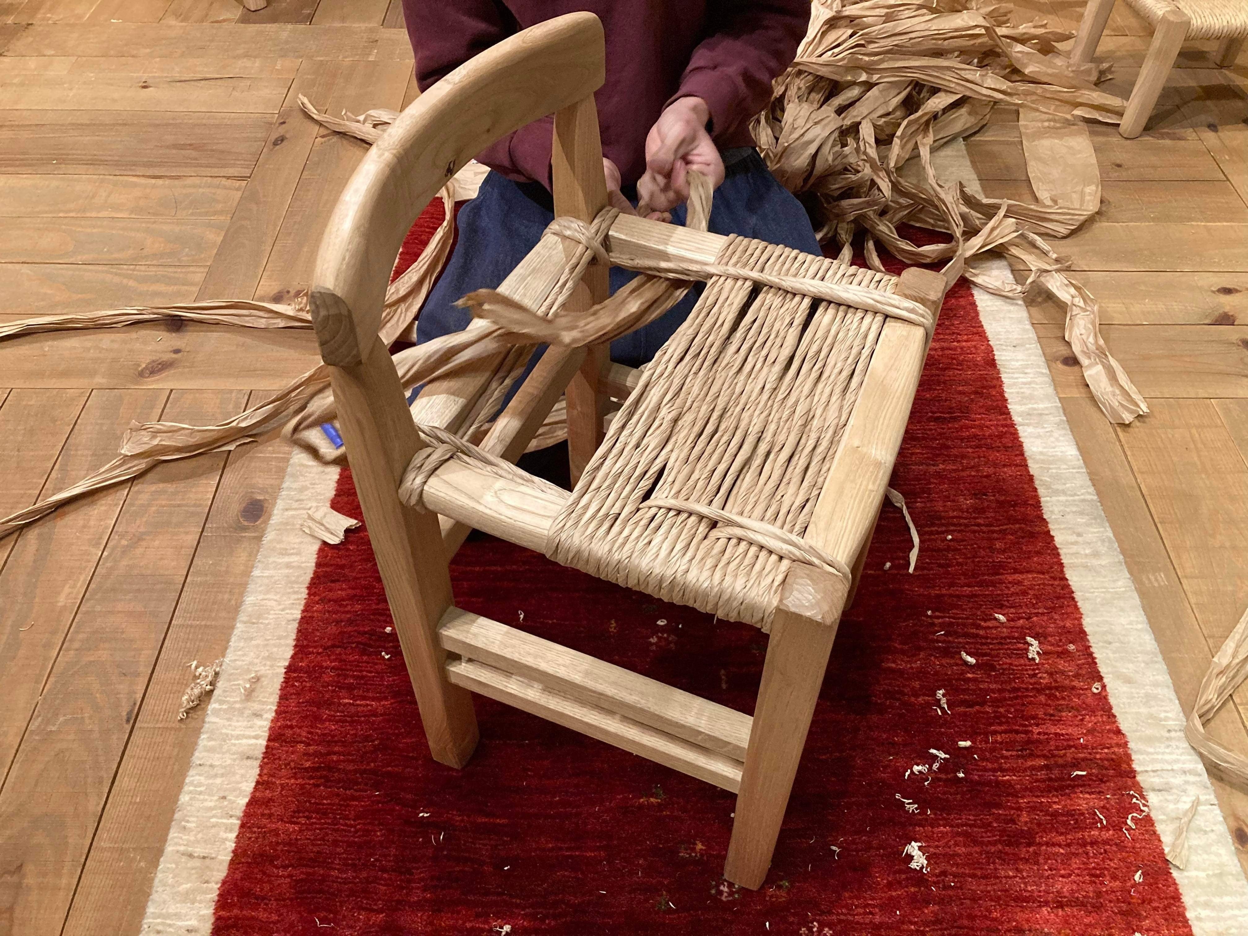 古民家リノベーションの際に、ショップとカフェのカウンター席の上部にあたるエリアの天井をぶち抜き吹き抜け空間としました。大変趣きがあって気に入っているのですが、冬は暖かい空気が上にあがってしまい寒く、夏は屋根から直接熱がきて暑く、少し問題がありました。カウンター席は、ベルギーの古いスクールチェアを使っているのですが、丹波篠山で座編みの椅子を作ってらっしゃる大橋力さんに民藝同人も愛したゴッホの椅子をモチーフに新たなデザインの椅子を作って頂く予定です。テマヒマのお客様の中には、食への意識が高くなる時期だからか妊婦の方が多いのですが、そんな方達にとっても心地よく座って頂ける椅子を目指しています。