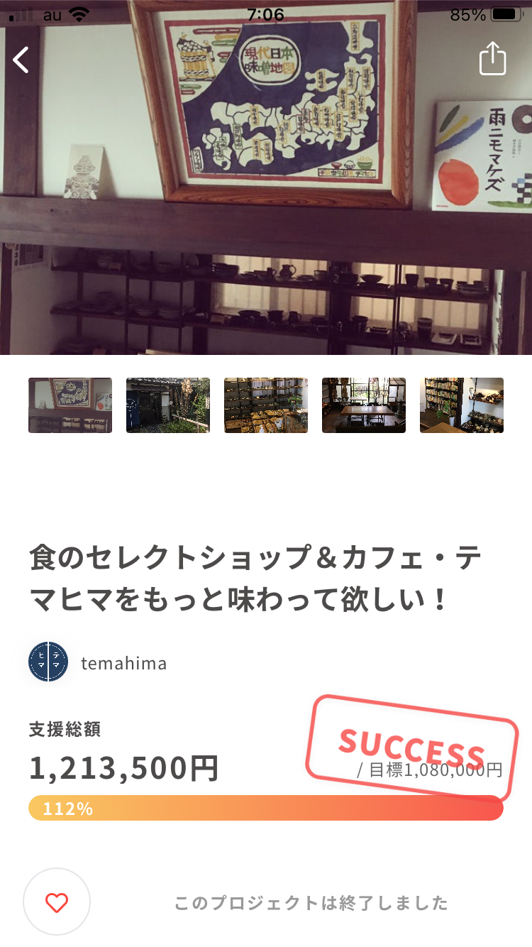 2021/07/08 11:2760日間と長期に渡りましたテマヒマのクラウドファンディングも昨晩無事終了しました。この間に126名(重複を除くと116名)の皆様から1213500円ものご支援を頂き、達成率112%と目標金額を大幅に上回ることが出来ました。ご支援頂きました皆様、ありがとうございました!今回のクラウドファンディングを通してテマヒマが多くの皆様に支えられてることを実感し、また頂きましたメッセージに心温まり励まされ、感謝の思いでいっぱいです。リターンにつきましては、準備出来次第、順次発送等させて頂きます。これからお作りするものもありますのでお届けまで気長にお待ちいただければと思います。取り急ぎご支援の御礼まで。今後ともよろしくお願いします。テマヒマの活動については、ブログやSNSでもご覧頂けますのでそちらもよろしくお願いします。ホームページwww.temahimaselect.jpブログhttps://www.temahimaselect.jp/pages/1651944/postsインスタグラムwww.instagram.com/temahima.jp/フェイスブックwww.facebook.com/temahimaselect.jp/ツイッターtwitter.com/temahima_jpLINEhttps://lin.ee/T54chuH もっと見る