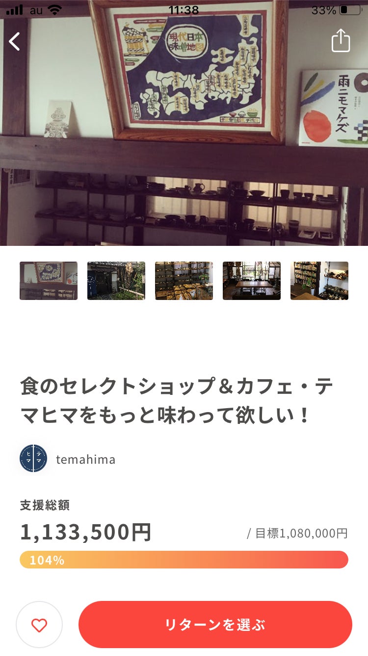 60日間と長期に渡りましたテマヒマのクラウドファンディングも昨晩無事終了しました。この間に126名(重複を除くと116名)の皆様から1213500円ものご支援を頂き、達成率112%と目標金額を大幅に上回ることが出来ました。ご支援頂きました皆様、ありがとうございました!今回のクラウドファンディングを通してテマヒマが多くの皆様に支えられてることを実感し、また頂きましたメッセージに心温まり励まされ、感謝の思いでいっぱいです。リターンにつきましては、準備出来次第、順次発送等させて頂きます。これからお作りするものもありますのでお届けまで気長にお待ちいただければと思います。取り急ぎご支援の御礼まで。今後ともよろしくお願いします。テマヒマの活動については、ブログやSNSでもご覧頂けますのでそちらもよろしくお願いします。ホームページwww.temahimaselect.jpブログhttps://www.temahimaselect.jp/pages/1651944/postsインスタグラムwww.instagram.com/temahima.jp/フェイスブックwww.facebook.com/temahimaselect.jp/ツイッターtwitter.com/temahima_jpLINEhttps://lin.ee/T54chuH
