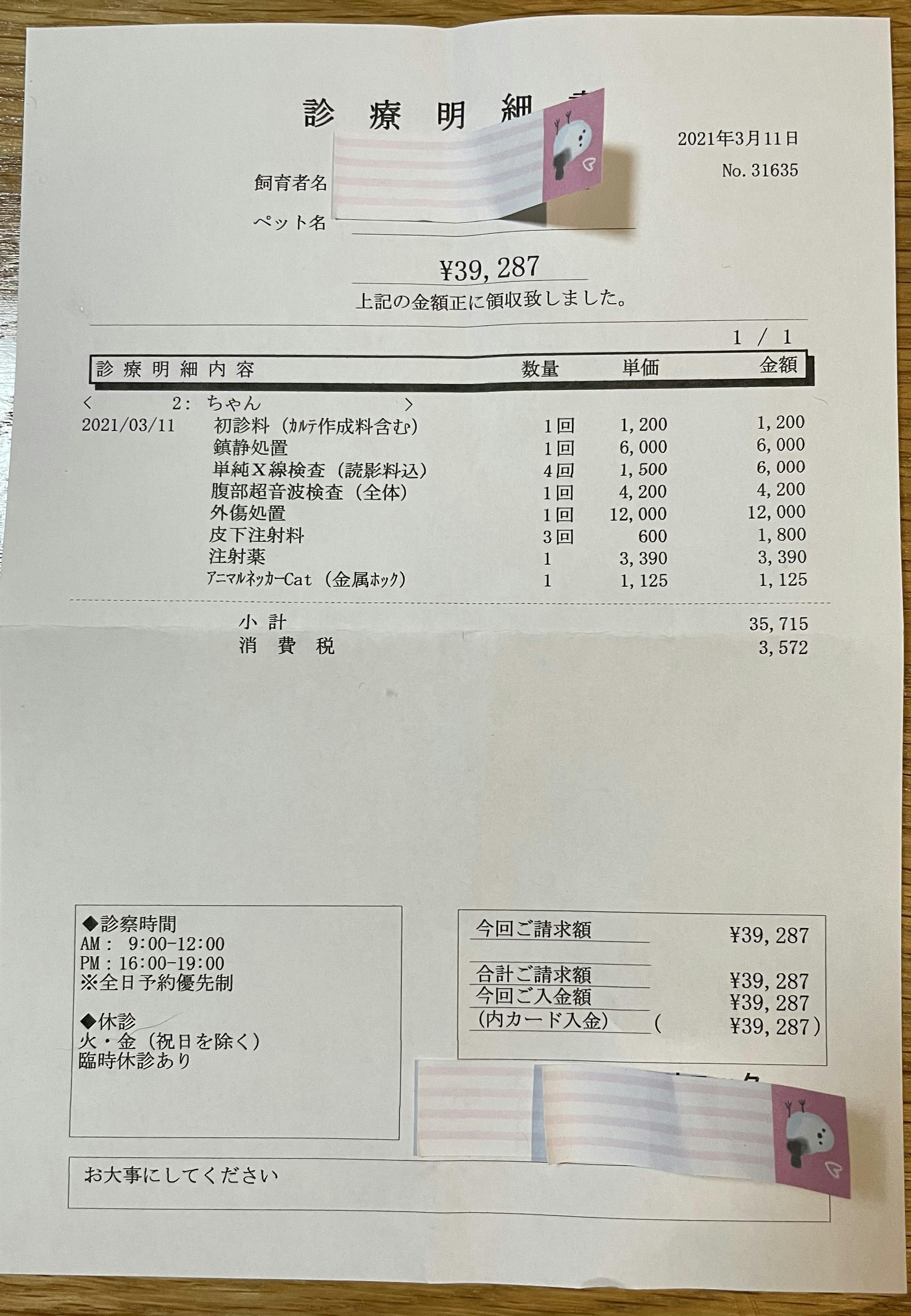 ひき逃げにあった日の明細は掲載させていただいております。