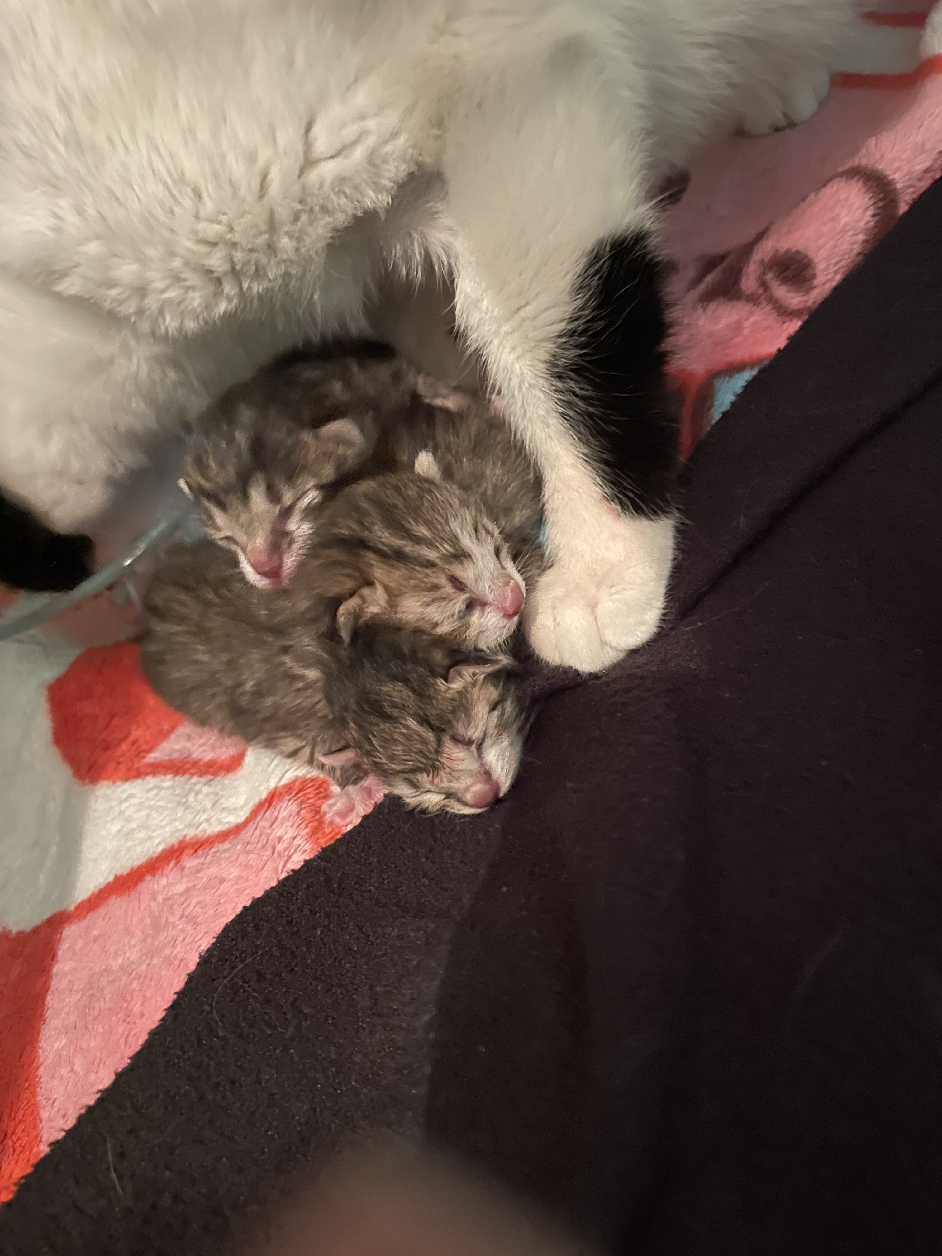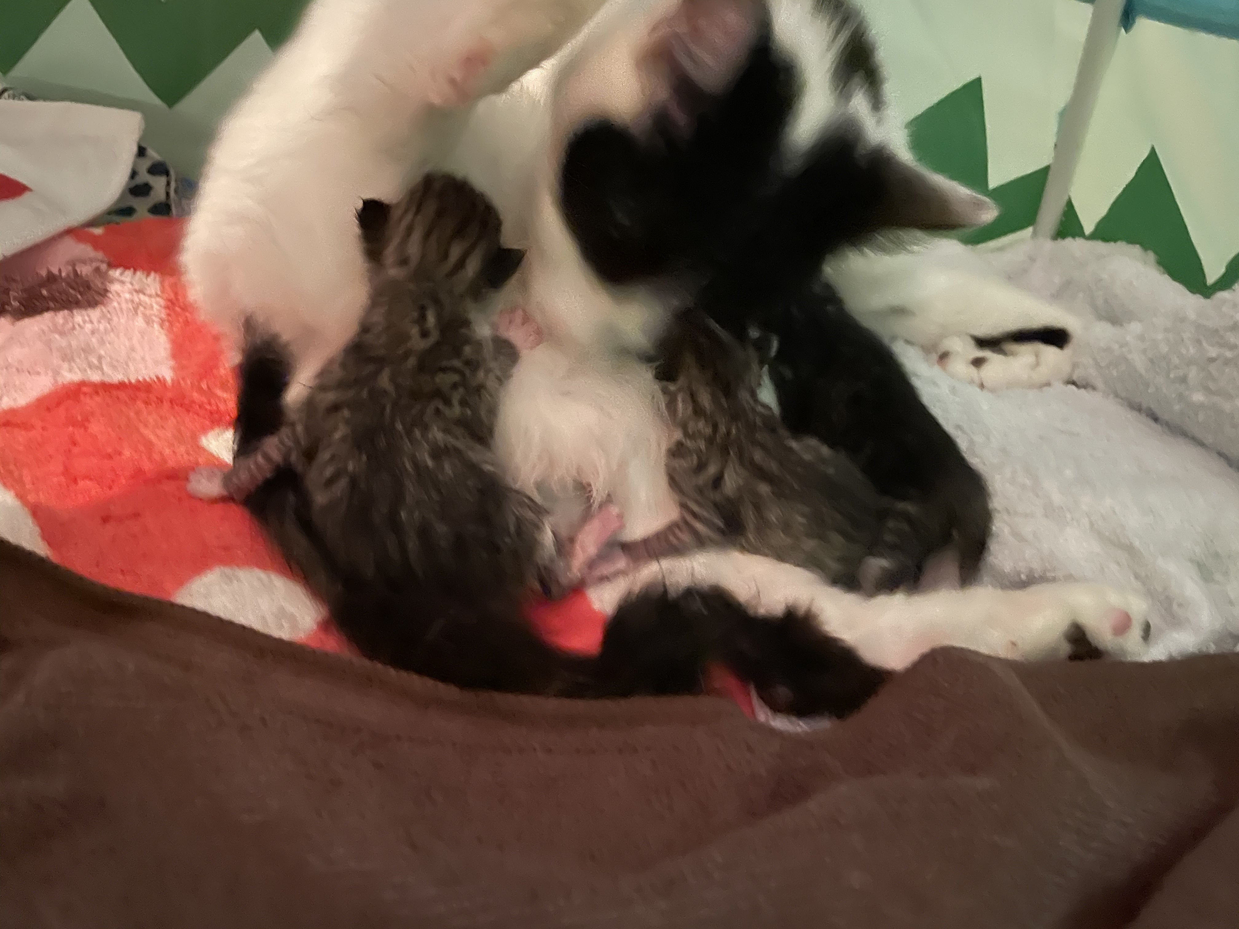 2ヶ月前の交通事故にあった日に妊娠超初期だったんだなと、保護して暖かい場所で出産できて本当によかったです。