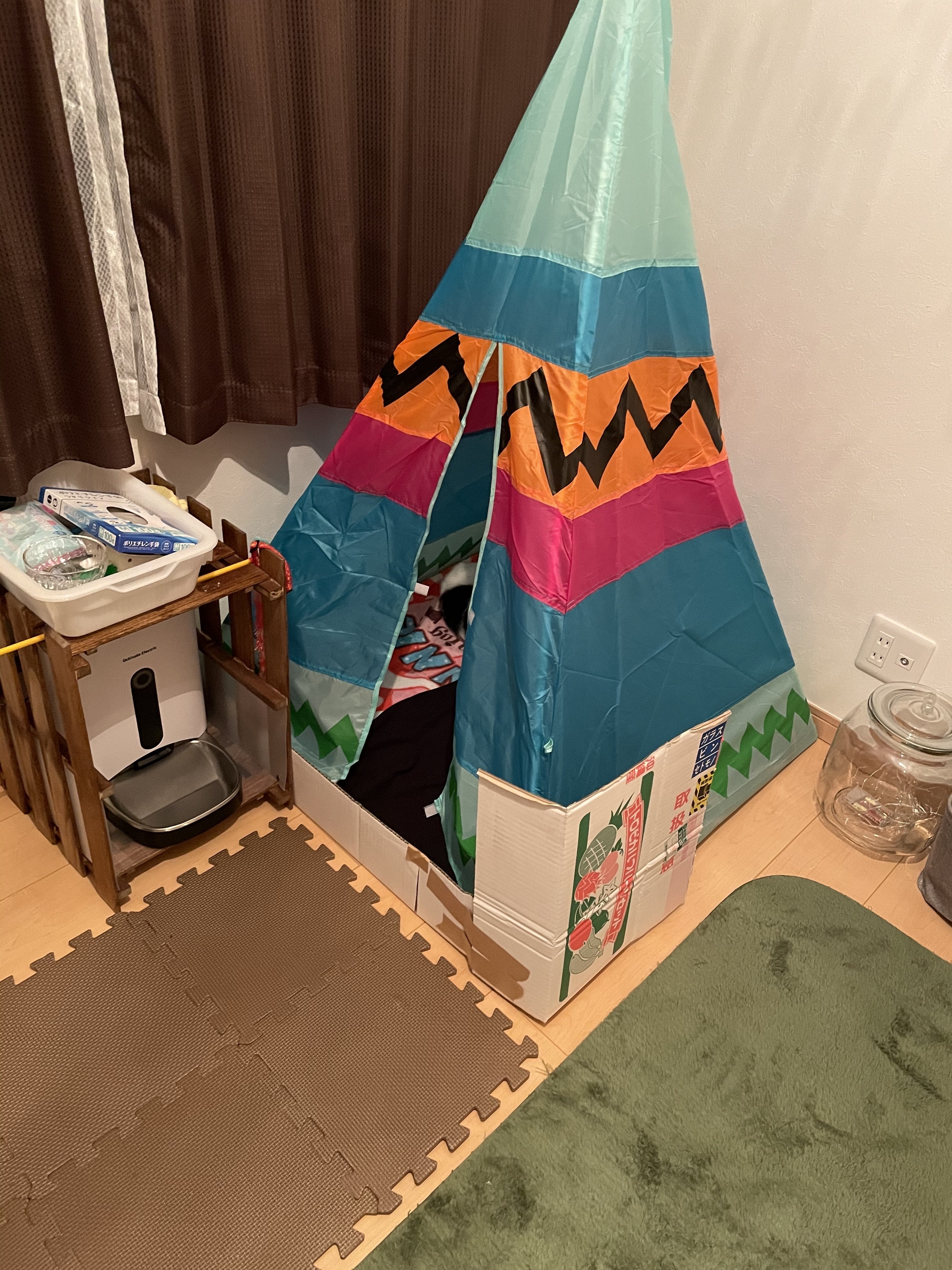 はとちゃんの、部屋にはゲージとは別に隠れ家的な感じで小さなテントを立てていて、その中で産んだので、新聞紙とシートとブランケットを引いて、テントから赤ちゃんが出ないように段ボールで囲いを作りました。