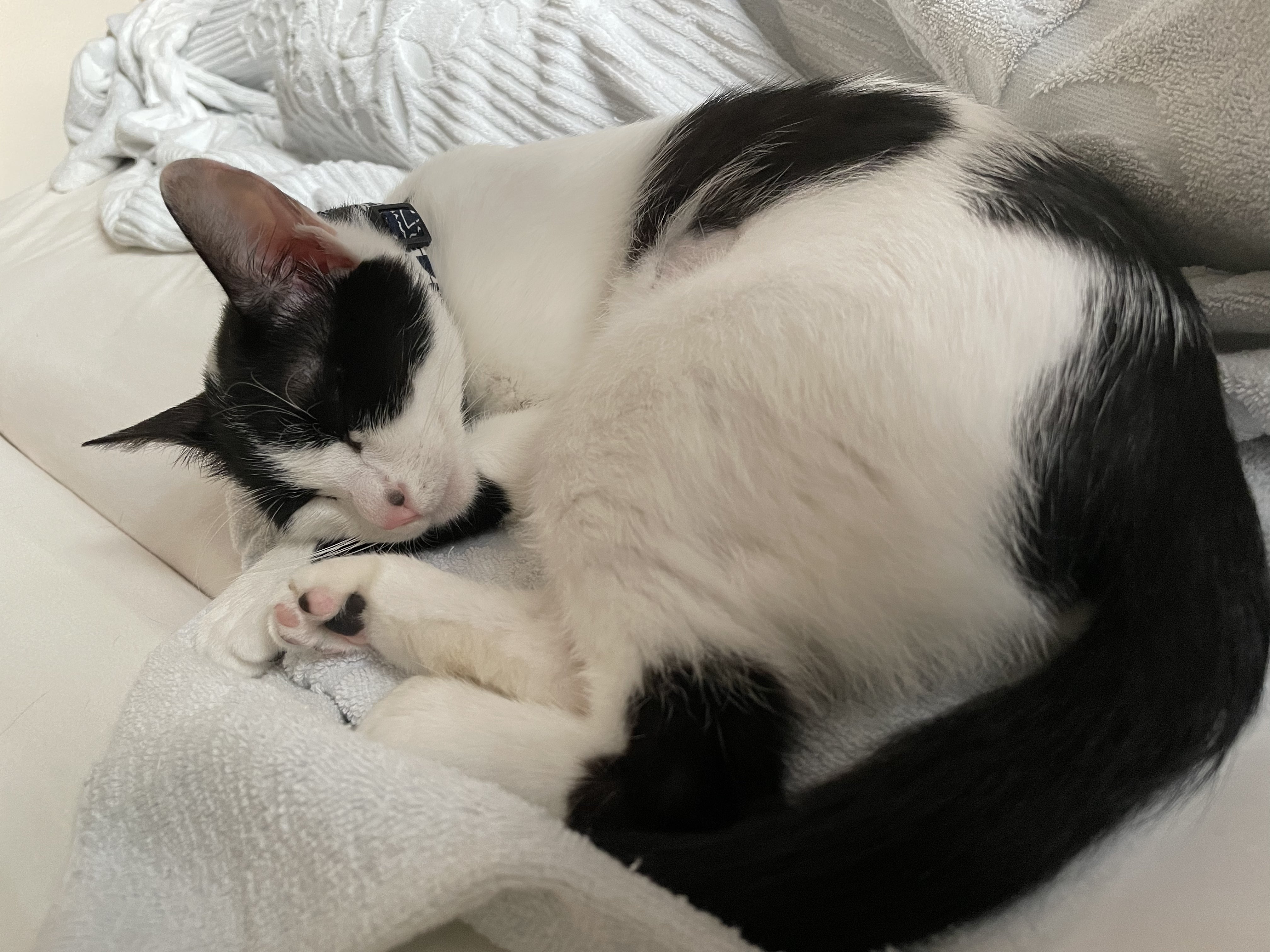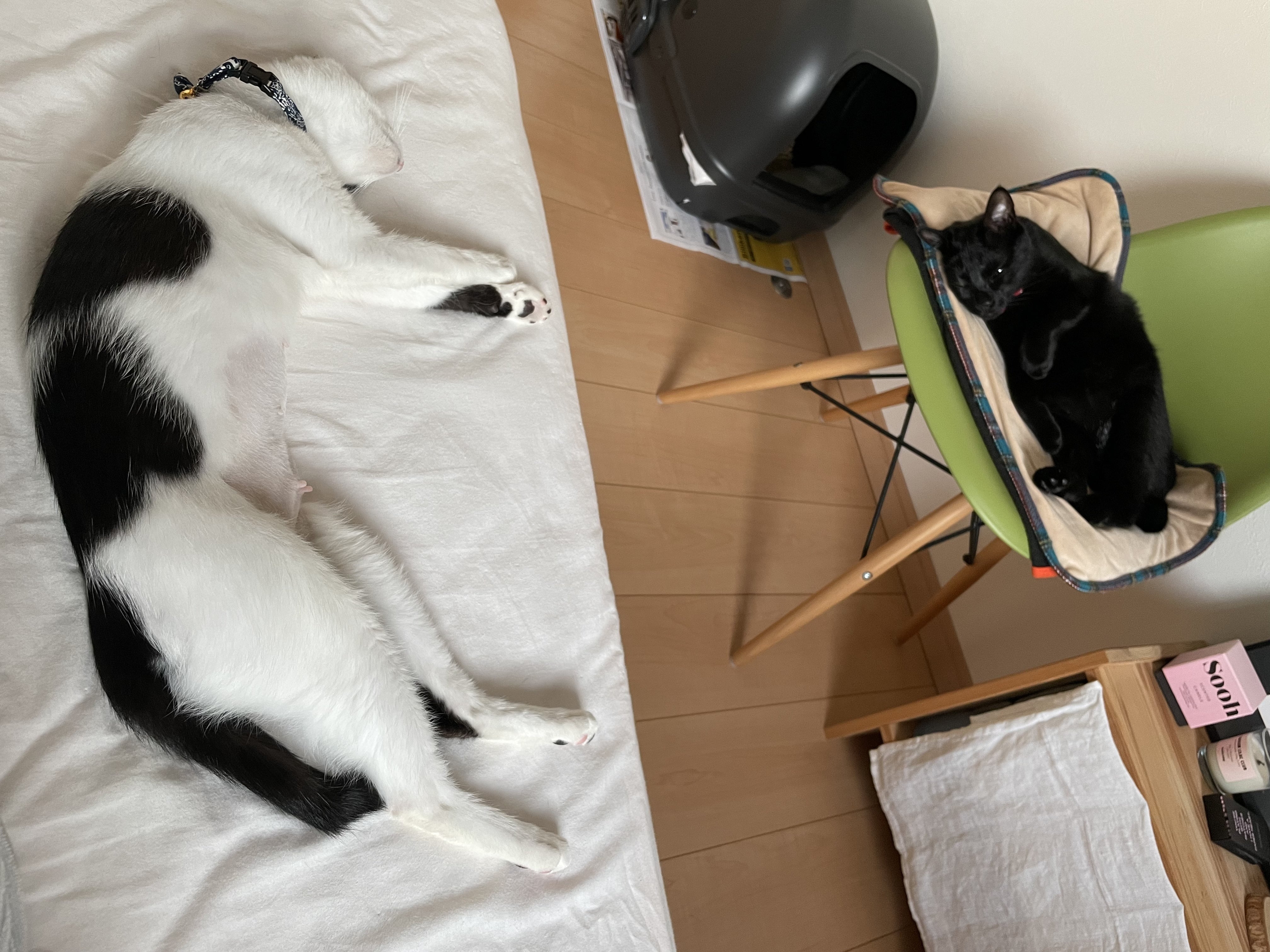 ワクチン接種後は疲れたのかベットの上でずっと寝ていましたが、次の日エリザベスウェアが取れた解放感で先住猫にちょっかいを出すようになりました。