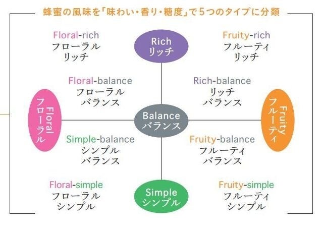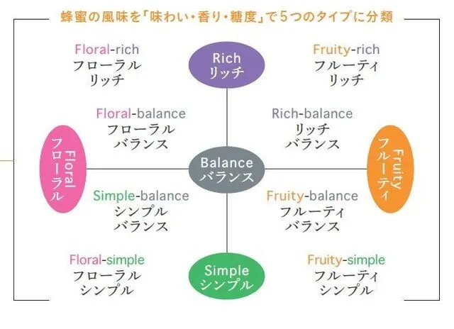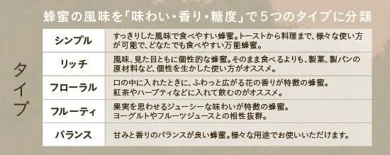 いろいろな花から採れる蜂蜜を「味わい・香り・糖度」により分類し、5つのタイプで表現しています。