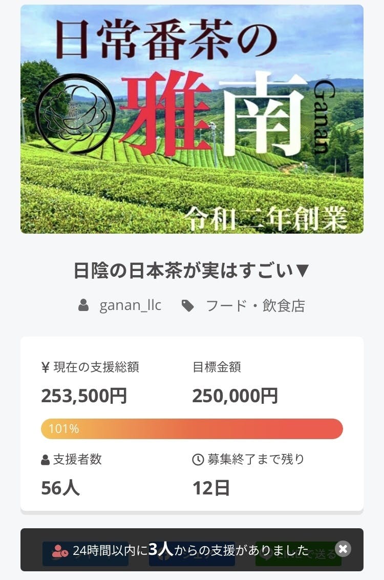 「こんなことやっている奴がいて、56人の支援者で目標達成したんだけど、あと12日だから番茶とかほうじ茶なんてどう?」