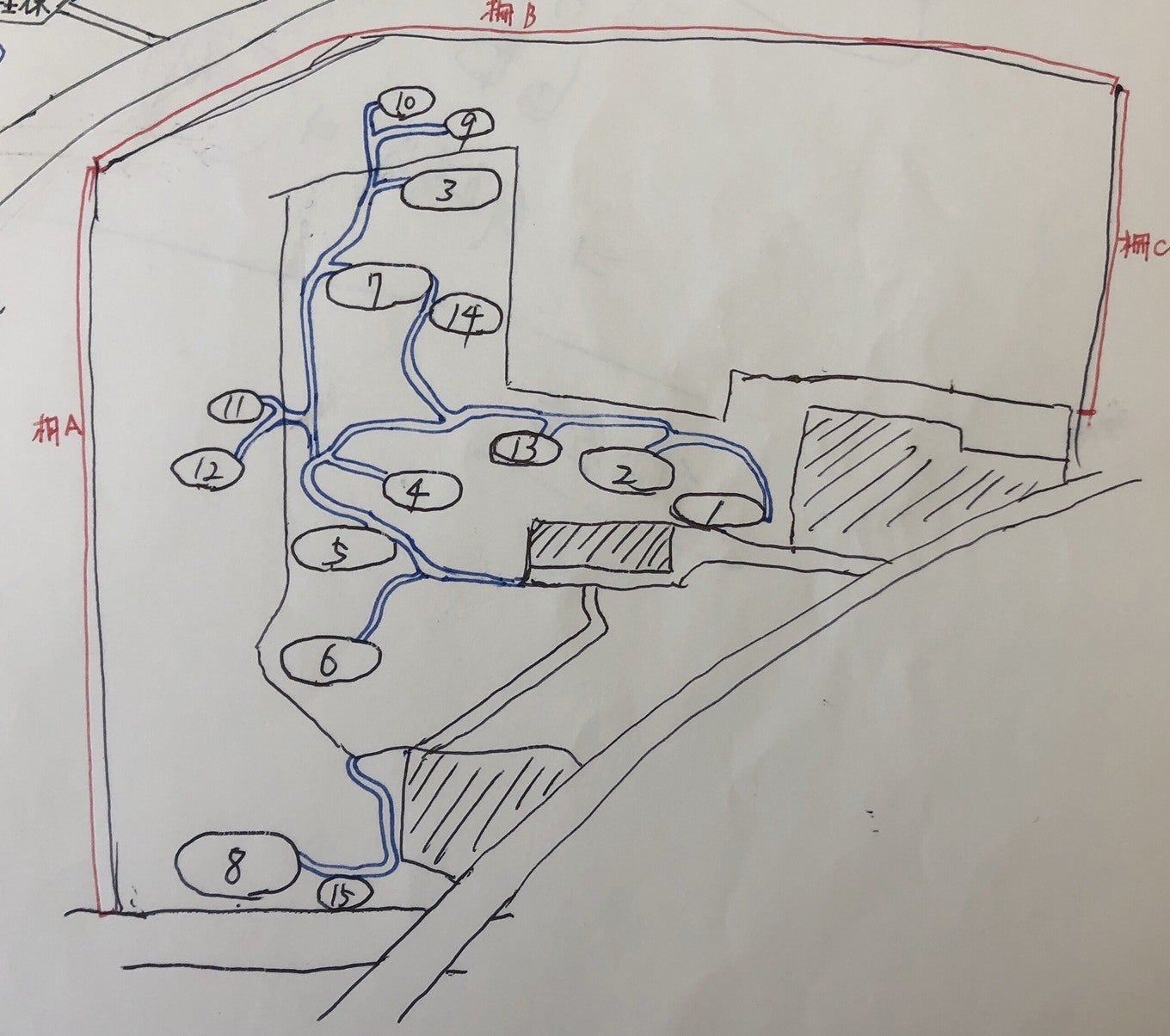 (野営地の想定①~⑮の手書きマップ)