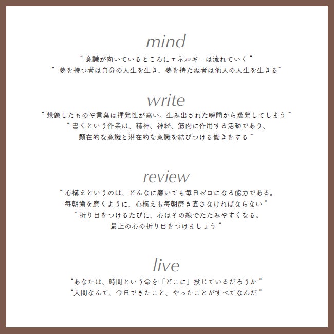 だから、この日記帳のコンセプトは「あなたのマインド・コンディションを高める日記帳」としました。《 理想を思い描き → 書きとめ → 見返し → 自分らしい人生を生きる 》というサイクルを回して、未来を創り出していくあなたを力づける存在を作りたいという強い思いがあります。