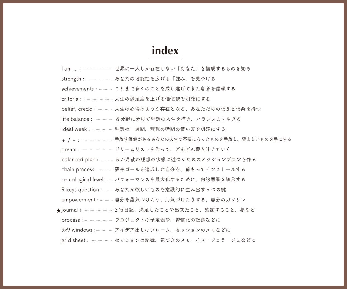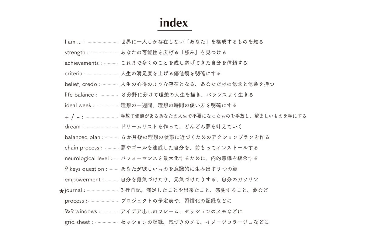 この日記帳は、毎日書ける半年分の3行日記「journal」や、自分を知ってよりよく生きるためのヒントがみつかるワークシートなど全18種類のコンテンツで構成されています。ページ順に進めたり、全て書き切ったりする必要はありません。気になるページから、好きなタイミングで取り組んで構いません。どこから始めようか迷う場合は、3行日記から始めるのがおすすめです。