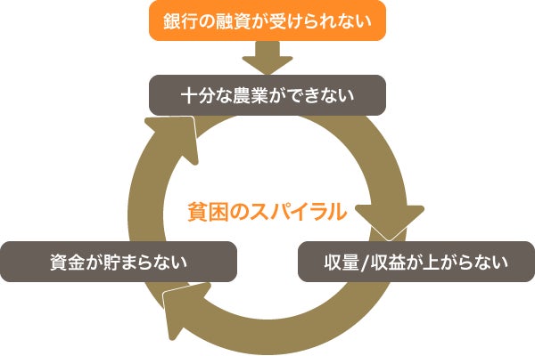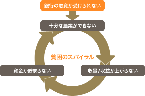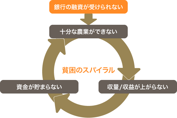 タンザニアの農民は、農業を始めたくても土地や資材を用意するための十分な資金がありません。また、銀行やマイクロファイナンス機関(※)から融資を受けようとしても、家や畑などの担保にするものがないため融資を受けることができません。