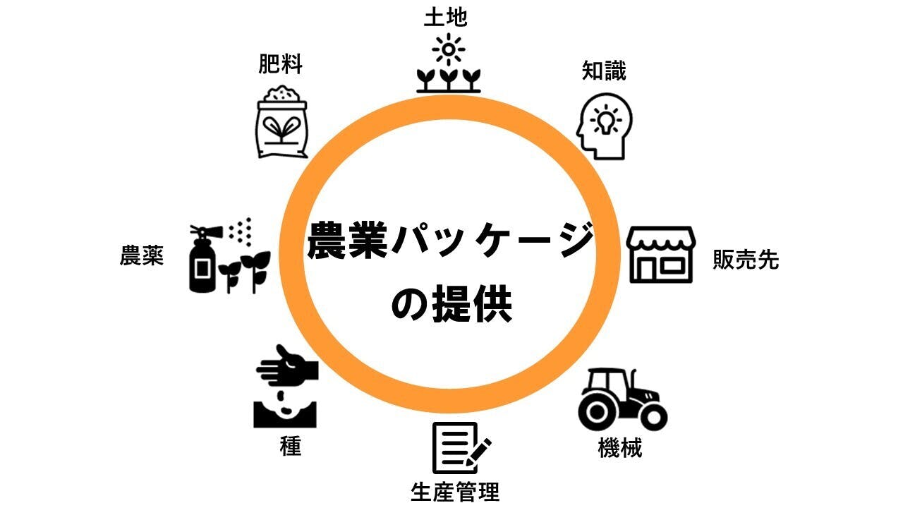 上記の課題に対してWATATUは、農業に必要な要素をすべてまとめた「農業パッケージ」を農家さんへ提供し、反対に、農家さんからはその土地に根付いたノウハウと労働力を提供してもらい、一緒に農業ビジネスを行う形を採用しています。