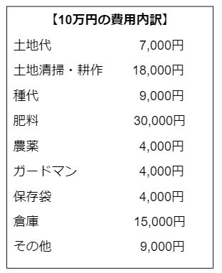 10万円で農家さん1人が3エーカーの土地で農業を始められます。そして、平均年間所得10万円に近い収入達成を実現することができます。