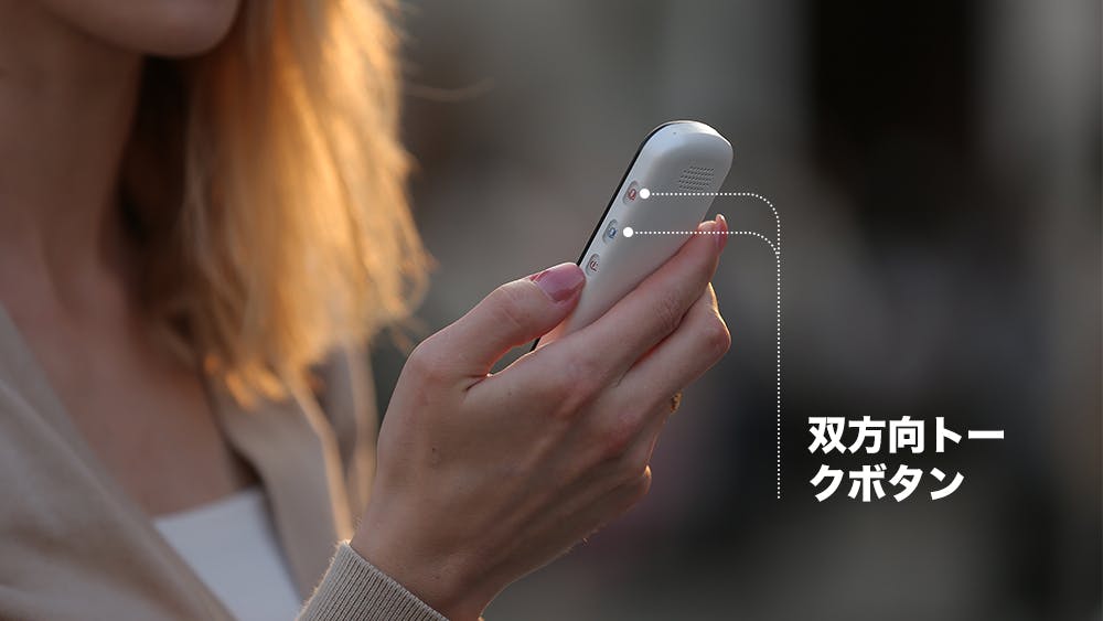 Vomorには、会話を翻訳するための2つのボタンがあります。片方のボタンを押しながら自分が母国語を話し、もう片方のボタンを押しながら相手が外国語を話ことで、シームレスなテキスト表示と音声再生が可能です。そのため、よりナチュラルでスムーズな会話が行えます。