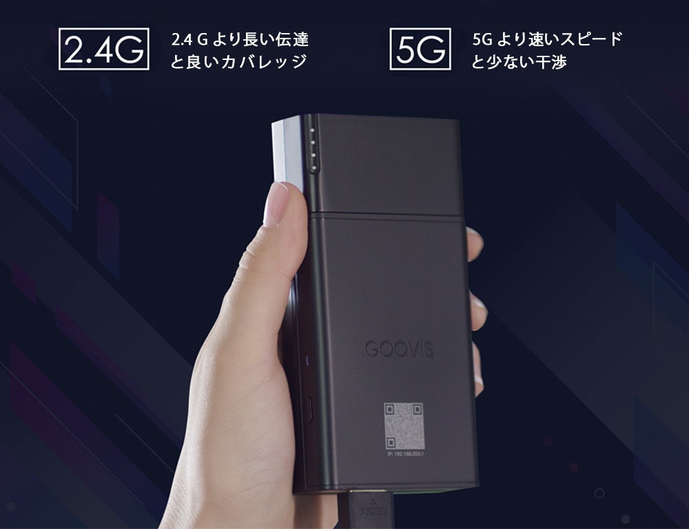 2.4GHz帯と5GHz帯に対応しているため、安定した通信が可能です。また、GOOVIS Wireless Cast は 802.11 ac プロトコルもサポートしているため、電波強度に応じた最適な帯域の切り替えを行えます。より質の高い映像データを、途切れることなく安定した状態かつ高速に転送できます。