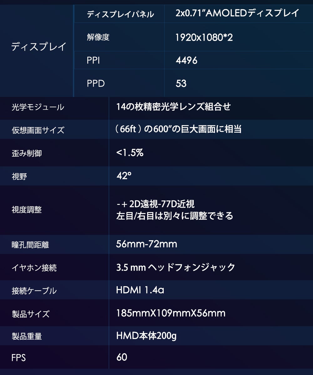 GOOVIS LITEは、デュアル3D M-OLEDディスプレイを搭載しており、今まででは不可能だった視聴体験が可能になります。従来と比べて、より高い輝度レベルやコントラスト比やはるかに広い色域を実現しており、輝度減衰もないため、より安定した動作が可能です。また、寿命も2倍に伸びています。