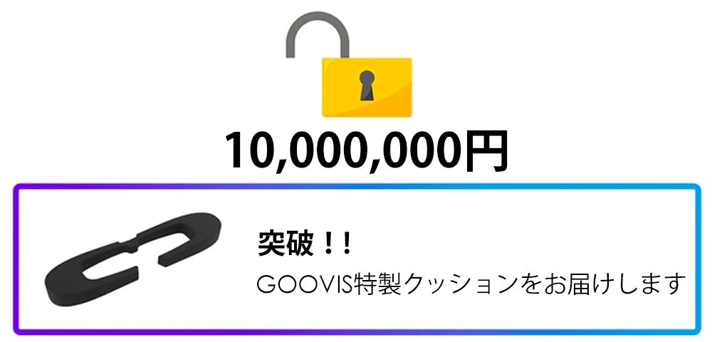 支援者の皆様、200人を超えるサポーターの皆様に続々とご支援をいただき、まもなく10,000,000円のストレッチゴールを突破いたします。皆様、ありがとうございます。こちらのマイルストーンをお祝いすることにあたり、皆様にGOOVIS特製クッションをお届けします。この点を可能な限り広く伝えてくださいませ!引き続き宜しくお願い申し上げます。
