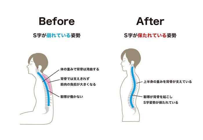 正しいS字の姿勢のときは、脊柱の後ろにある長い靭帯が役割を果たし、背骨を起こしてくれます。そのため、筋肉が余分な働きをせずに済み、疲れにくくなります。