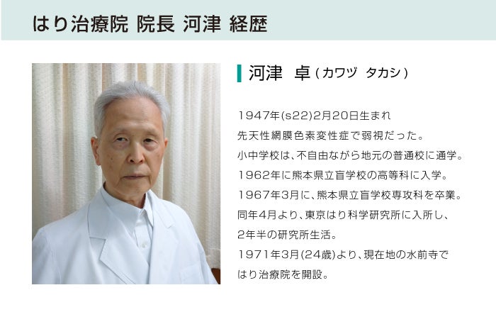 熊本にて「河津はり治療院」を開いております河津卓と申します。今回のプロジェクトでは、私の長年の無謀な夢が現実となり、喜びでいっぱいでございます。
