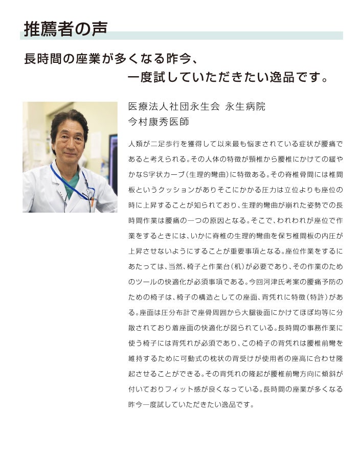昔から、間違った姿勢で座ることによって背中を痛めている方を診る機会が多く、特にパソコンの普及にともない、その傾向は強くなっていきました。おそらく何百万人もの方が同じように苦しんでいらっしゃるだろうことを考えると、何かせずにはいられず、「椅子に背中を合わせるから、背中や腰を壊す。それならば、背中に合わせることができる椅子をつくろう」と決意し、無謀な夢へのチャレンジを始めました。