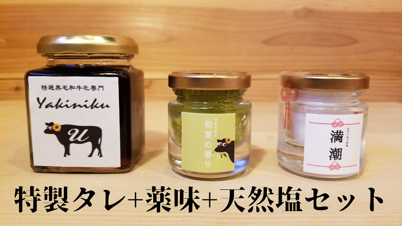 特選黒毛和牛牝専門 焼肉Uの特製タレ+薬味+天然塩セットです。