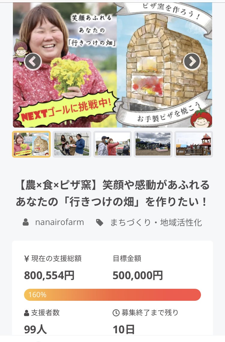 2021/04/29 22:39ネクスト目標の80万円達成しました!ネクスト目標の80万円に到達しました。皆さま、本当に本当にありがとうございます!!改めて感謝の気持ちを込めて御礼申し上げます。2019年4月に独立就農をして丸2年が経ちました。2年は本当にあっという間で周りの方々に支えられながら農業を続けられています。今回の『行きつけの畑』プロジェクトも現在99名の方々から支援をいただき、金額の多さよりも支援いただいた方の人数に驚いています。正直始めるまでは、一農家が勝手にやりたいと思っていることが皆さんに賛同いただけるのか不安しかありませんでした。しかし始めてみてその不安が自信に変わり、皆さんとよりパワーアップした七彩ファームを作り上げるぞというワクワク感で今はいっぱいです!!支援していただいた方、応援していただいている方1人1人が私たちの大切な仲間であり、皆さんがいてこその七彩ファームです。改めて、皆さまこれからもよろしくお願いします。そしてまだまだ七彩ファームを『行きつけの畑』にしていただく方を増やしていきたいと思っています。プロジェクトの支援応募期間は残り10日間となりますが、周りの方々にお声かけいただけると嬉しいです。また日々の活動報告はFacebookやInstagramで更新してますのでご覧いただけると幸いです。https://www.facebook.com/nanairofarm2019/ もっと見る改めまして…目標達成のお礼とNEXTゴールについて