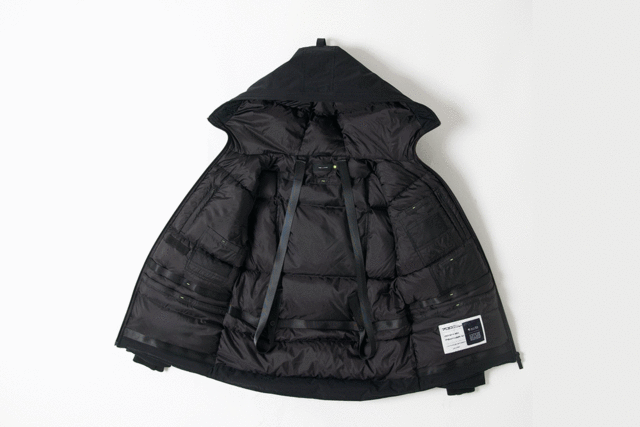 このダウンはデザインの段階からインナーにパーカーを着ることを想定し、パーカーのフードがキレイに収まるように形状を細かく調整しています。