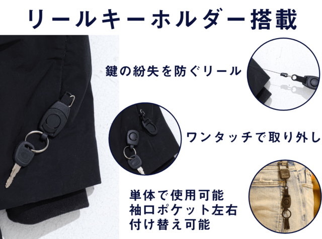 鍵用のポケットの内側にはリールキーホルダー搭載。