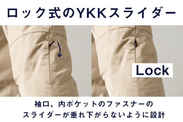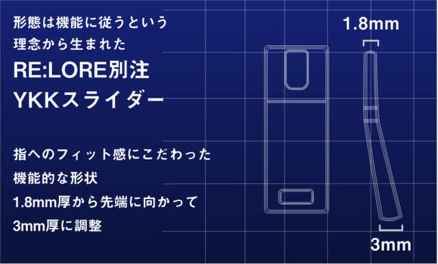 RE:LOREオリジナルスライダーを使用したYKKの止水ファスナー使用。