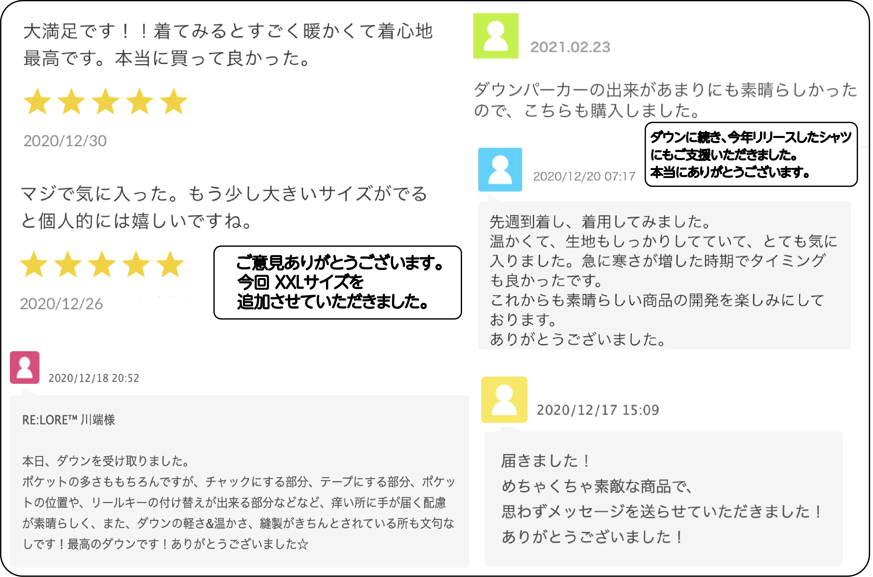 おかげさまで、このダウンジャケットをご購入いただいたお客様からは、たくさんの応援とお褒めのお言葉をいただいております。