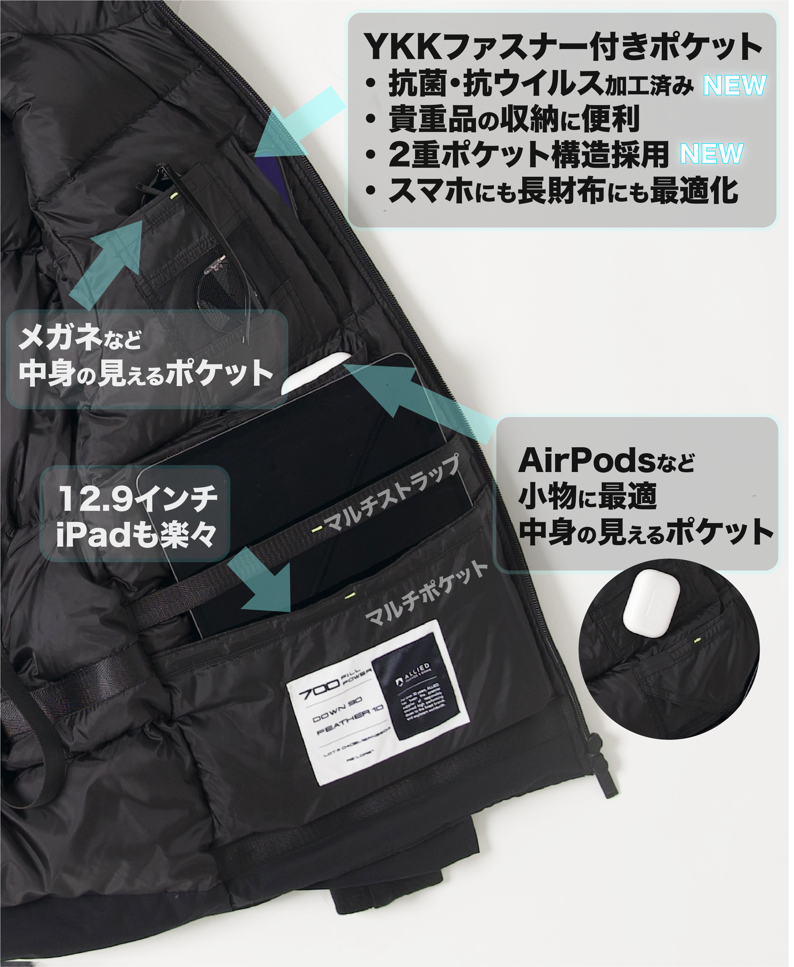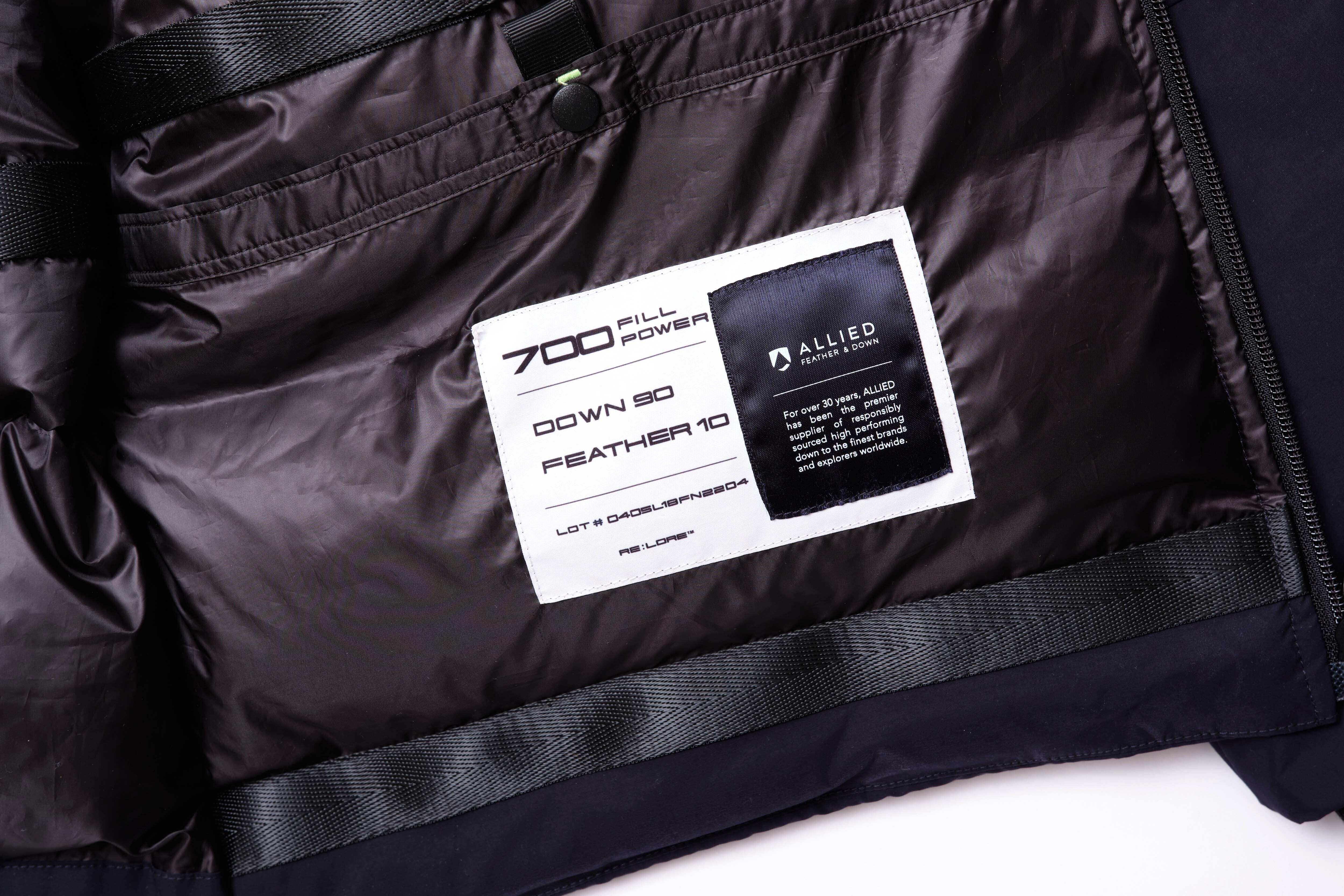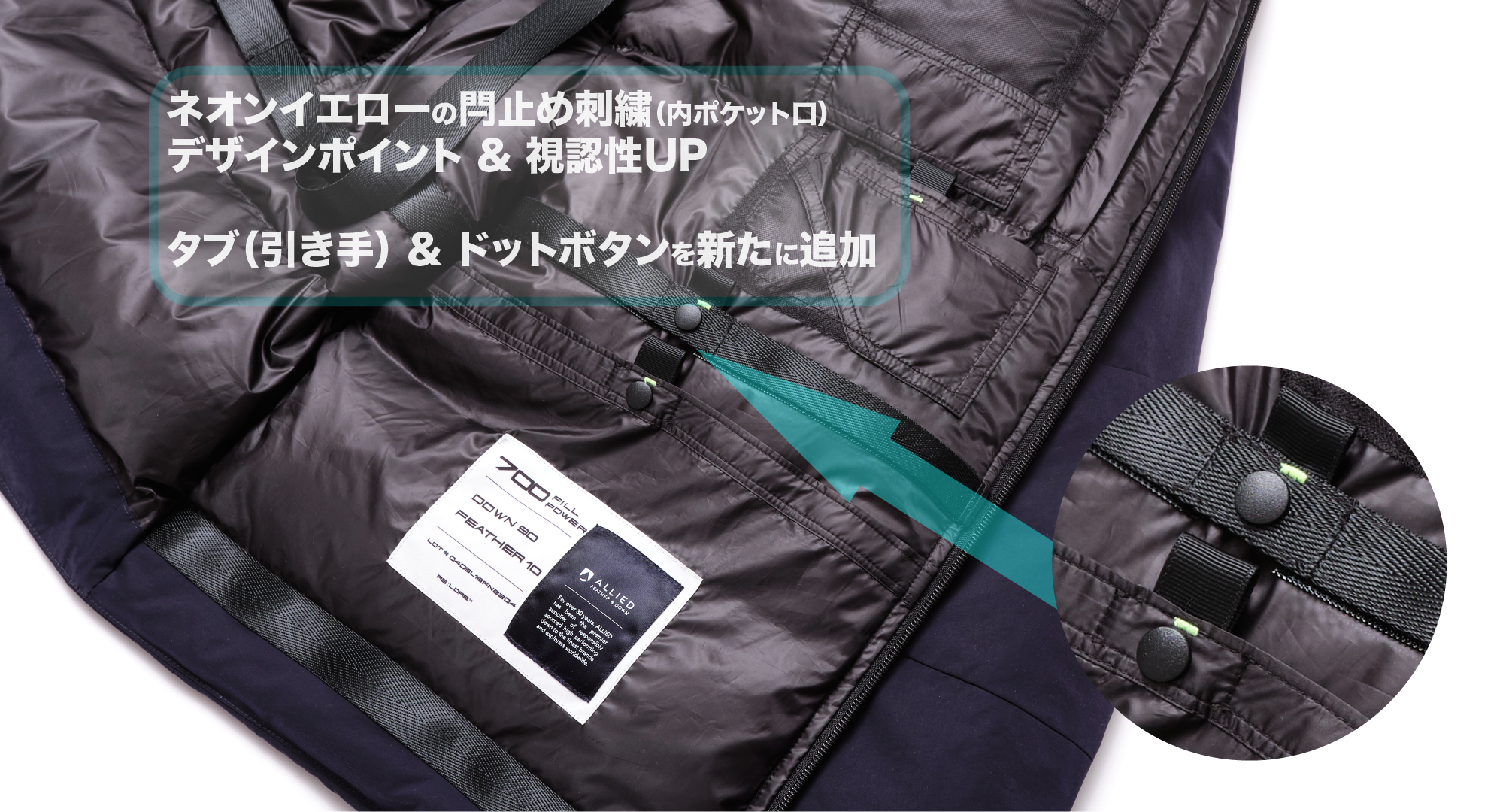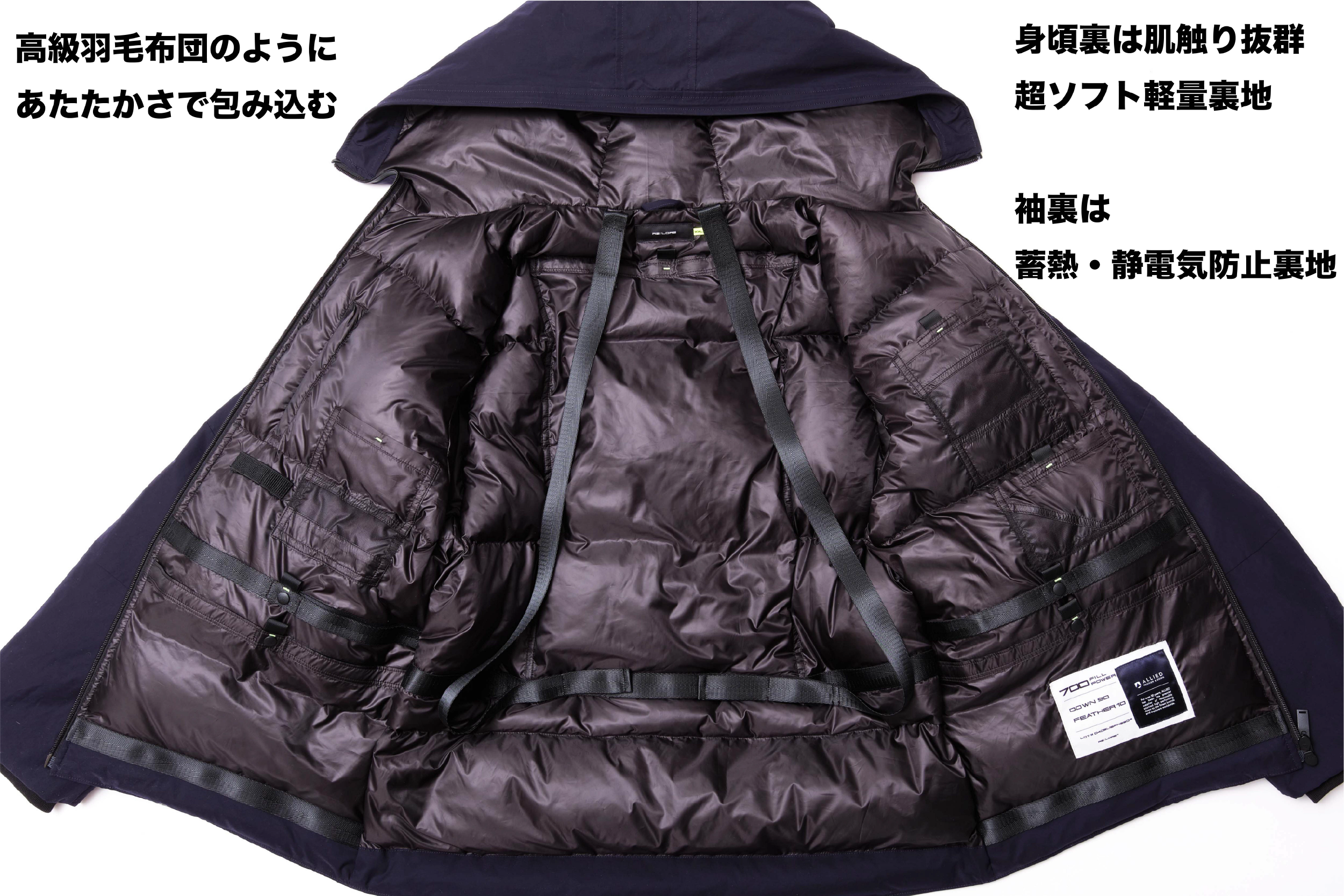 環境保護、動物愛護に積極的に取り組んでいる世界トップレベルのプレミアムダウンサプライヤー『ALLIED FEATHER & DOWN社』(アライドフェザー&ダウン社)の保温性に大変優れた700FILL POWER(フィルパワー)の高級ダウンを贅沢に約200gを封入。