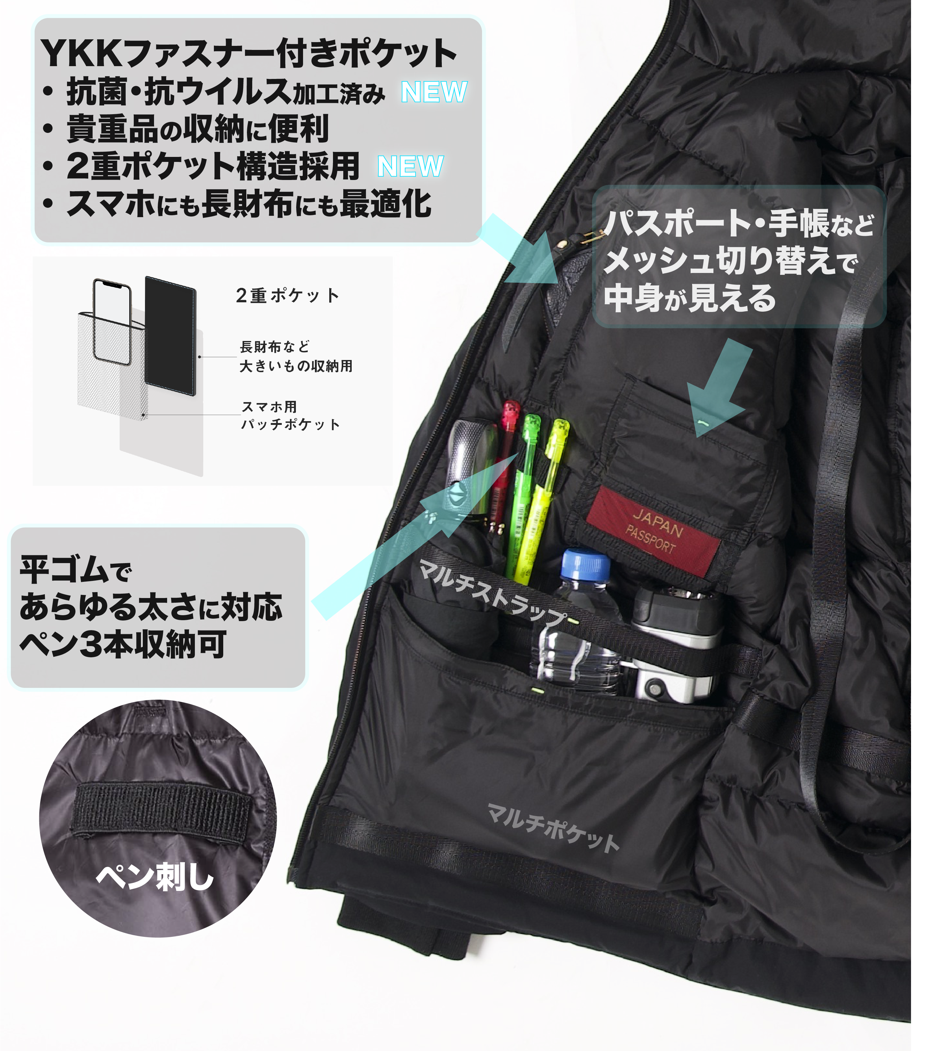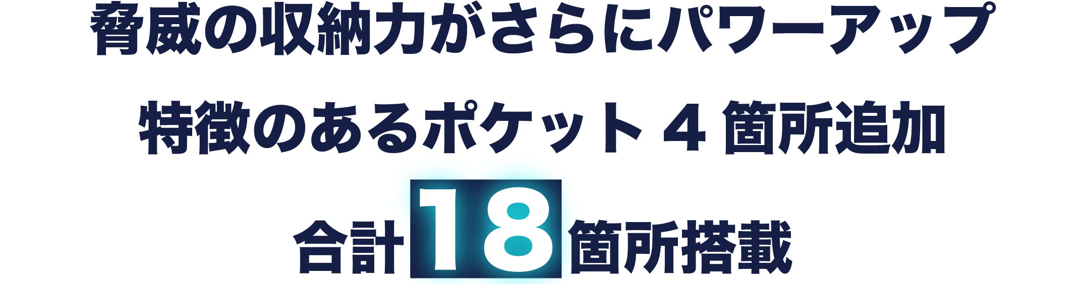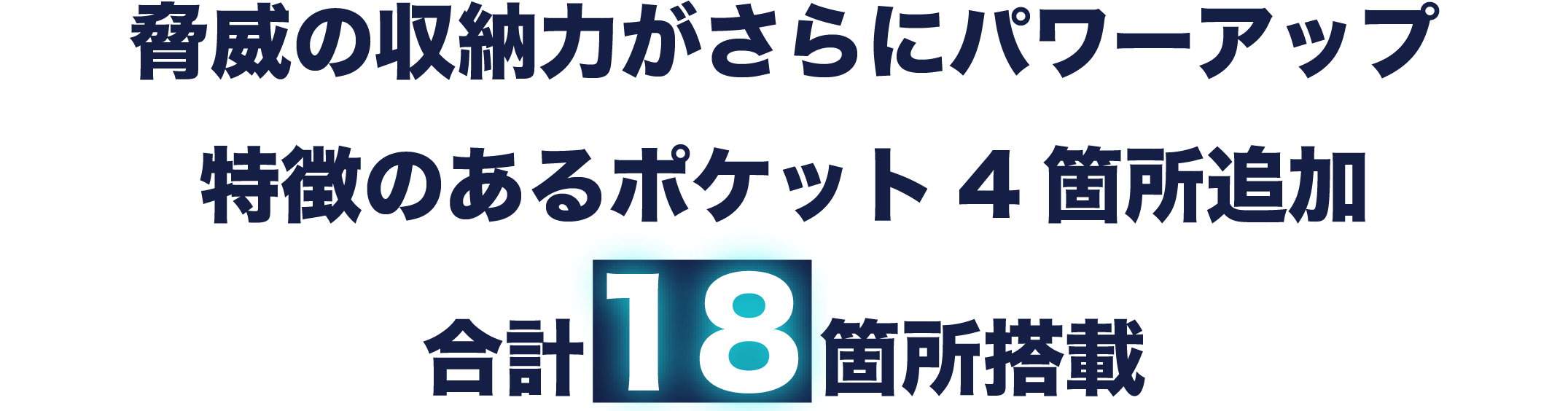 ① さらに『4箇所』ポケット追加!合計18ポケット搭載!
