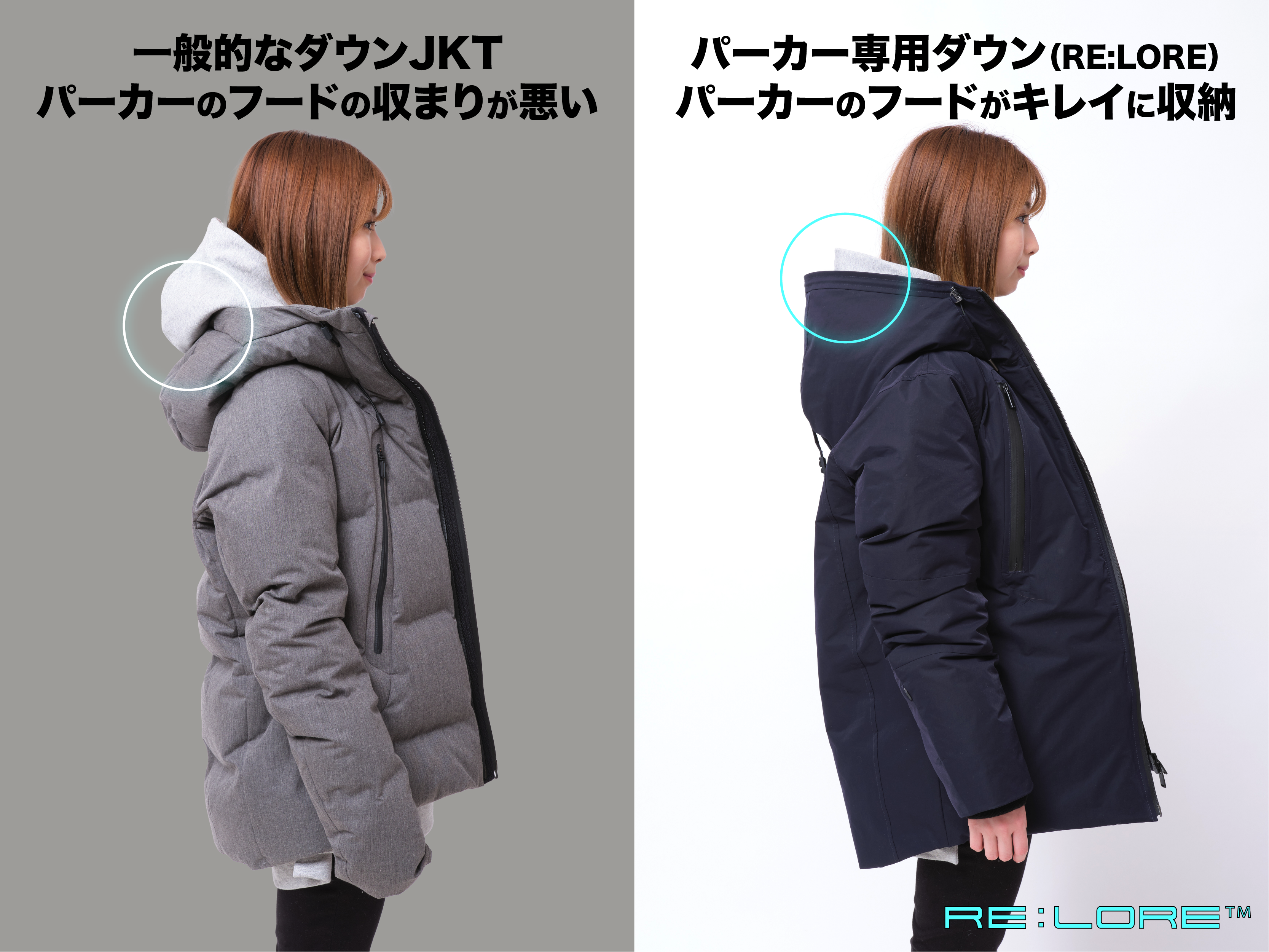 700FILL POWER(FP)・・・一般的に550FP以上が上質なダウンとされているが、RE:LOREはそのはるか上を行く700FPを採用。