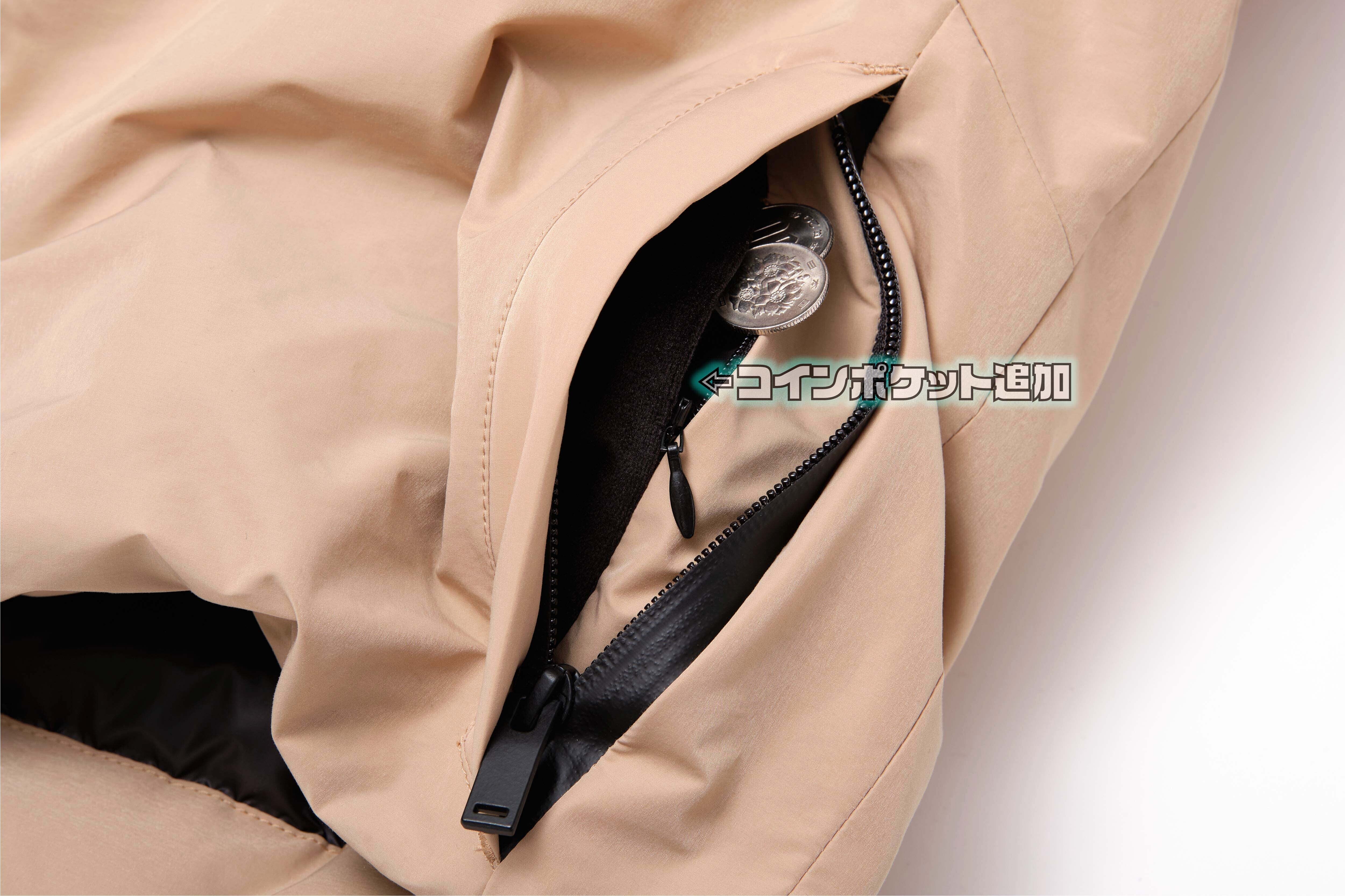 マウンテンパーカーのデザインは胸に大きなポケットが付いているため、腰ポケットがなく不便に感じることが多いのですが、RE:LOREのダウンジャケットは腰ポケットも完備!