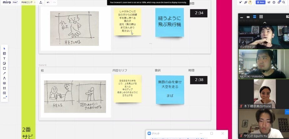 オンラインで可能な「Miro」というツールを使って付箋で意見を出したり、歌詞に合わせてどういったシーンが必要なのかなどを作っています。