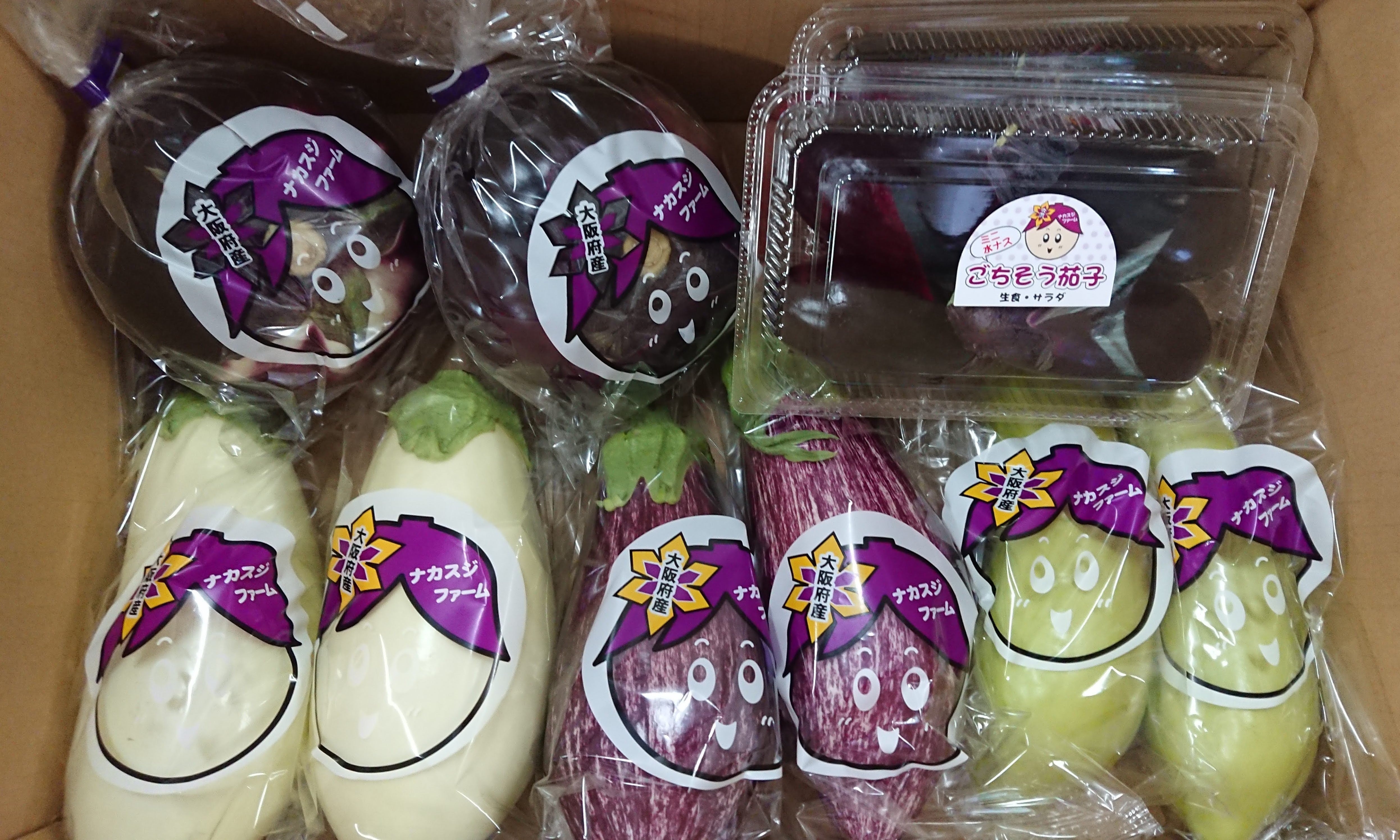 大阪ナス「千両」・白ナス「揚げてトルコ」・緑ナス「ますみ」・長緑ナス「長緑」・大長ナス「ふわとろ」・生食ナス「ごちそう」・丸ナス「京まんじゅう」・米ナス「くろすけ」・ゼブラナス「縞むらさき」・水ナスから状態の良いものを5種類程度詰め合わせします。