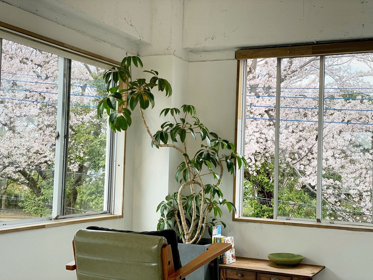 春には、大きな窓越しに見る満開の桜を堪能できます。
