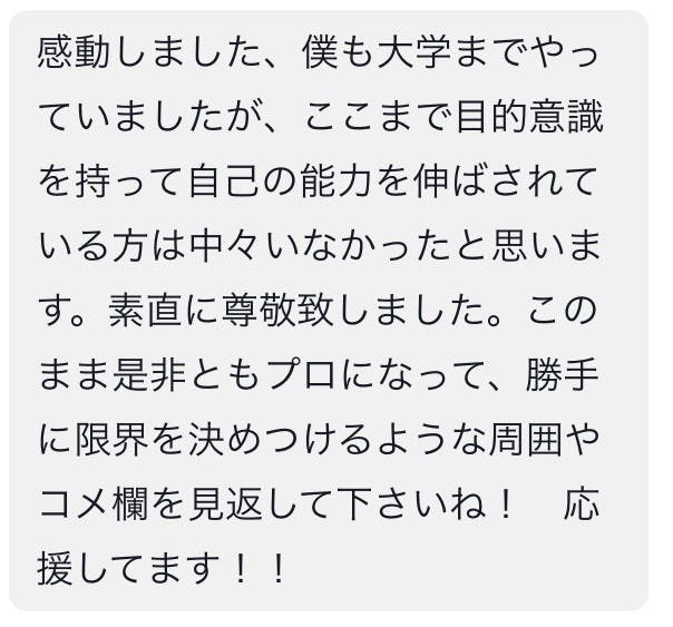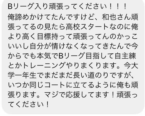 僕の挑戦は、今の所25歳までと決めてます。それまでにBリーグ入りできなければ、夢を断念しようと思っています。リミットを決めたのは、ダラダラと日々を過ごさないためです。期限を決めることによって、毎日何をするべきか、を明確にできました。だからこそ皆さんの協力が必要です。