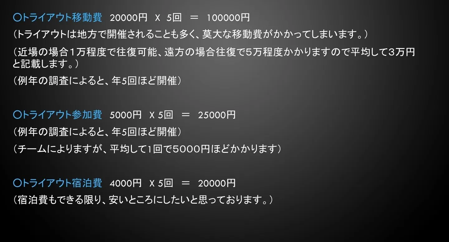 トライアウトは地方での開催が多く、そのほとんどが遠方なため莫大な『移動費・滞在費』が必要になります。(開催地はバラバラです。直近でいうと4月長崎県・6月東京・7月埼玉・大阪で行われました)