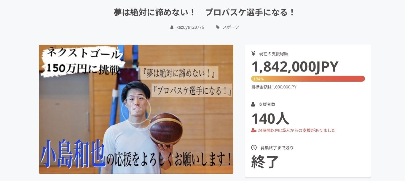 クラファン 終了 1842000円の支援金が集まりました